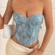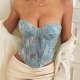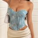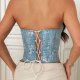 This dazzling sequin corset top features a strapless design and a shimmering blue finish, perfect for making a statement at any event. The fitted silhouette and back lacing ensure a flattering fit, while the sparkling details add a touch of glamour to your look.