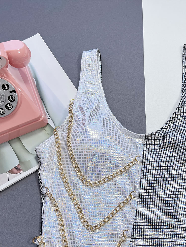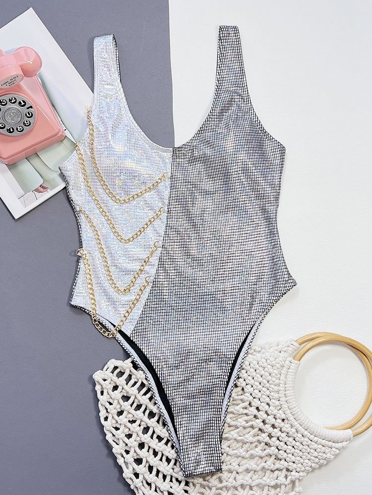 Shine bright in this sparkling silver one-piece swimsuit, featuring elegant chain detailing that adds a touch of glamour. The shimmering texture catches the light, making it perfect for those who want to dazzle at the beach or poolside. The flattering cut ensures you feel confident and stylish.