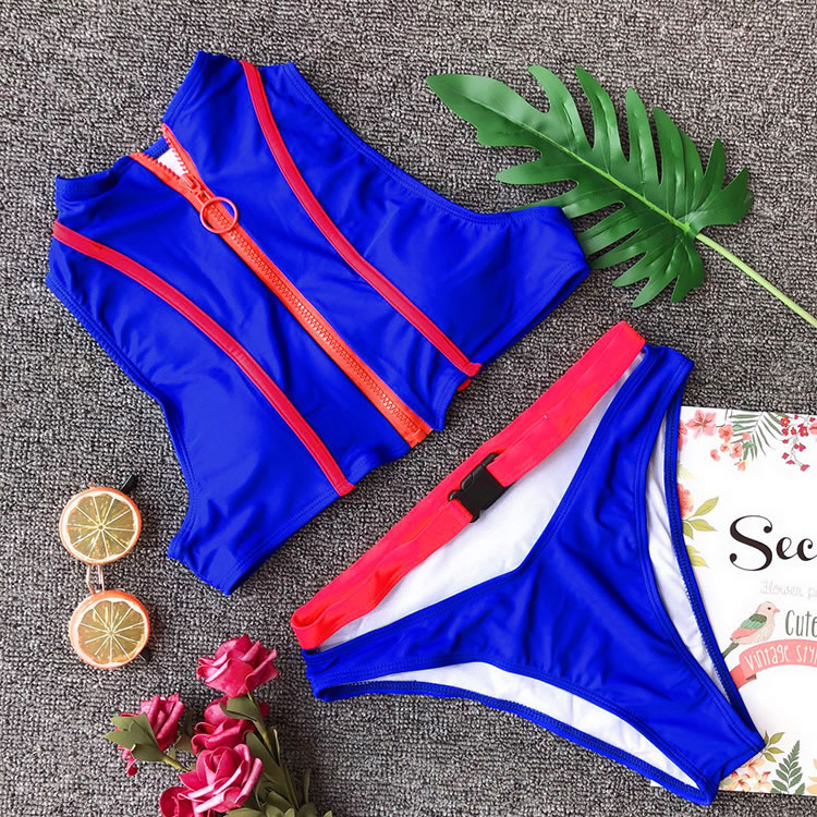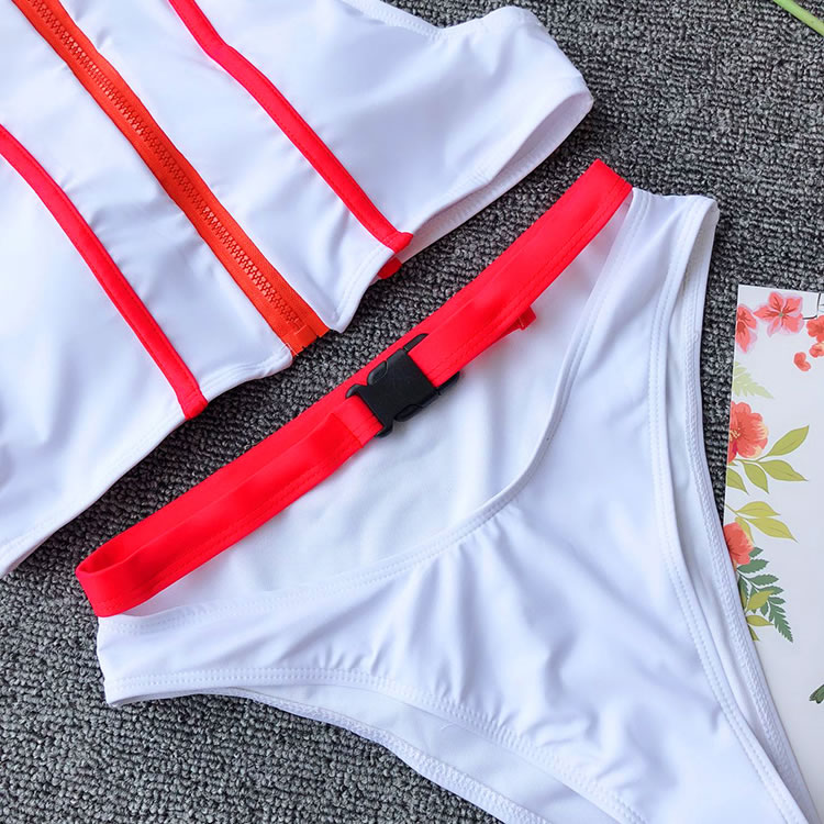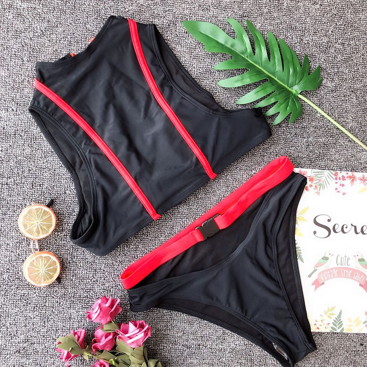 Look sporty sexy in this two piece swimsuit featuring a racerback top with a zipper, and a matching bottom with a red waistband, and a cut-out front, cheeky cut back.