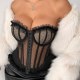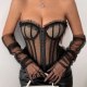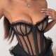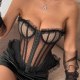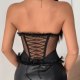 Channel a bold and playful vibe with this strapless black corset. Crafted from sheer mesh fabric adorned with classic polka dots, it features structured vertical for a defined silhouette. The top and bottom hems are finished with delicate ruffled trim, adding a touch of feminine flair. A dramatic lace-up back with adjustable ties allows for a custom fit, making this piece perfect for creating standout looks for nights out or themed events.