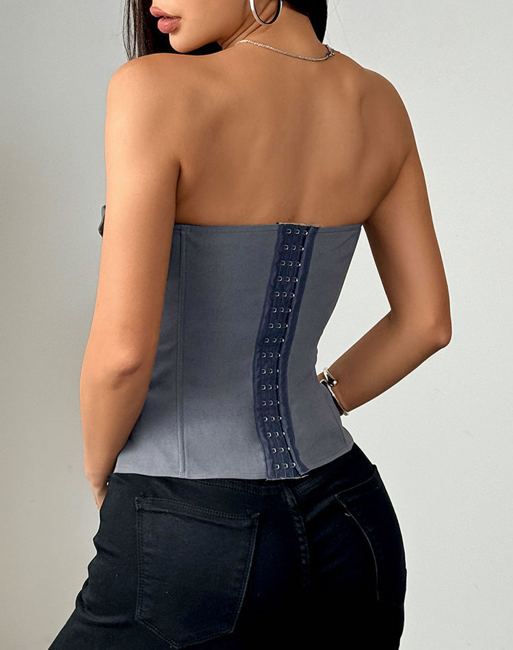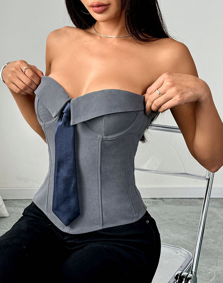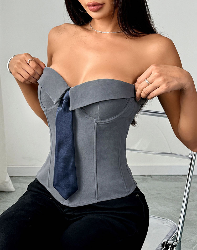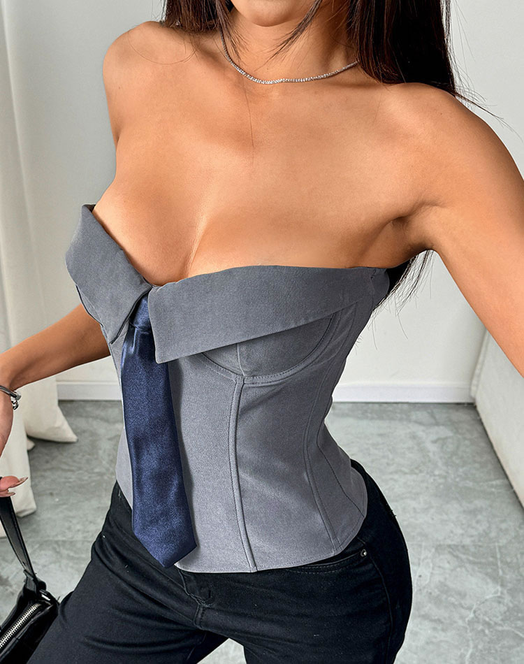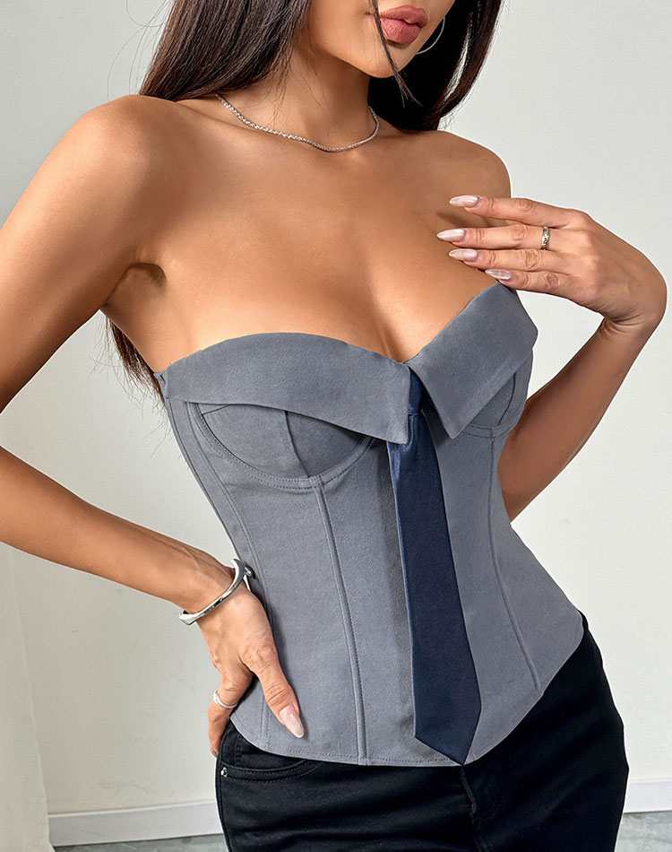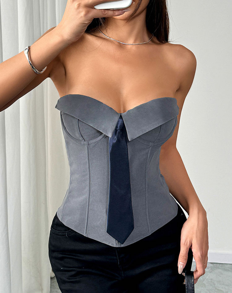 Experience the blend of chic design and versatility with this grey corset top featuring a navy tie. The structured fit and sweetheart neckline offer both comfort and style, making it a versatile piece for various occasions.
