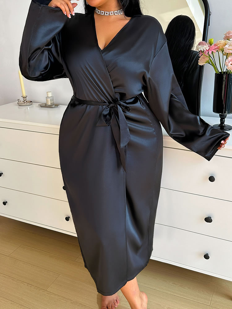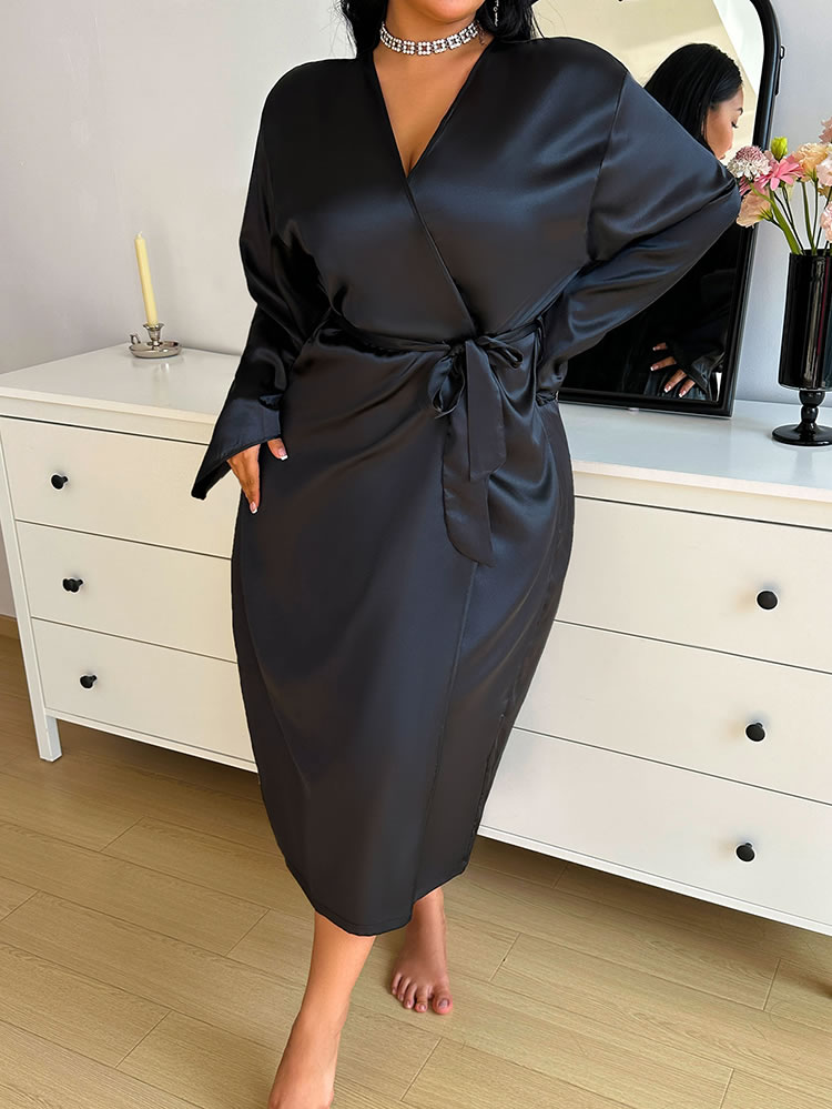 Step into elegance with this stylish black satin kimono. The sleek design features long sleeves and a waist tie, providing both comfort and a chic look. The soft material ensures a gentle feel, making it a stunning option for relaxing nights or as a chic loungewear piece.