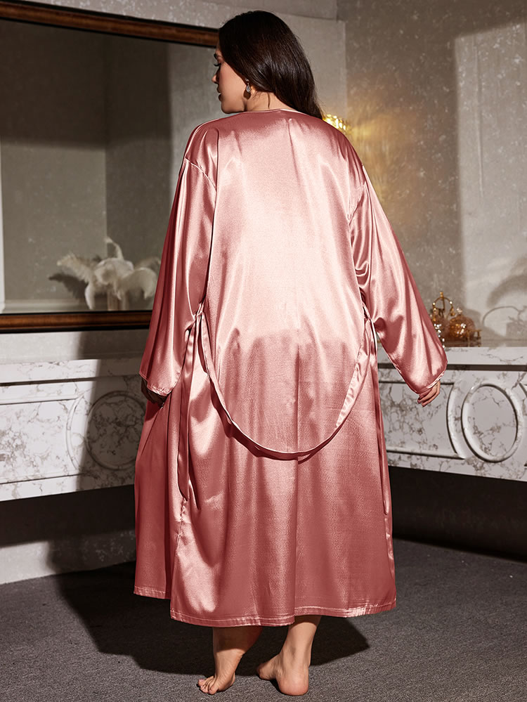 This charming pink satin nightgown is adorned with delicate lace trim that adds a touch of elegance and femininity. The soft, smooth fabric ensures ultimate comfort, making it perfect for relaxing evenings. The matching robe provides additional coverage and style, enhancing the overall look.