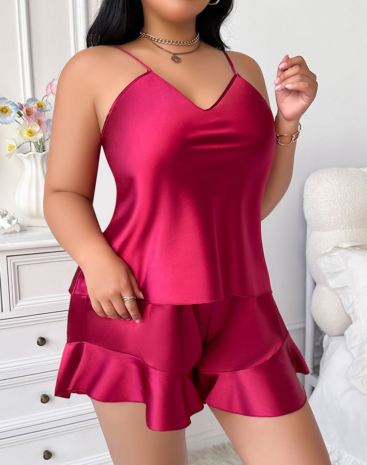 Elevate your loungewear collection with this stylish red satin set. The camisole boasts a V-neckline and thin straps, offering a sleek and modern look. The shorts feature charming ruffle details at the hem, enhancing the overall appeal. Made from soft satin fabric, this ensemble ensures ultimate comfort while maintaining an air of sophistication.