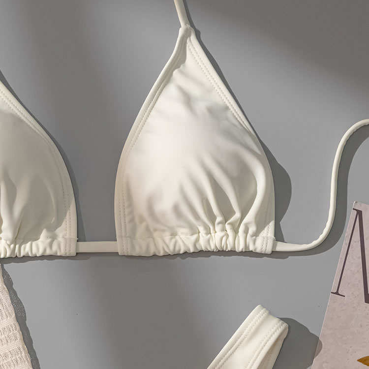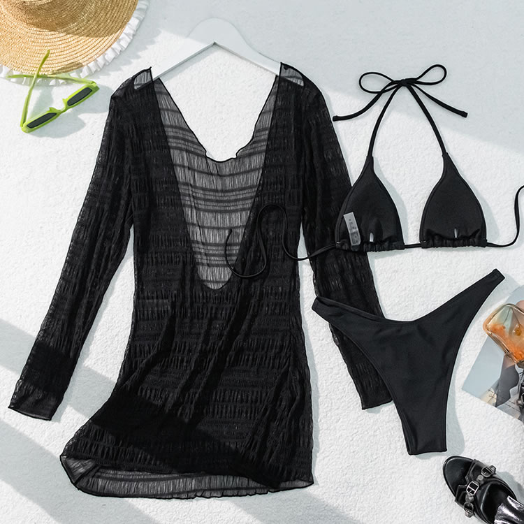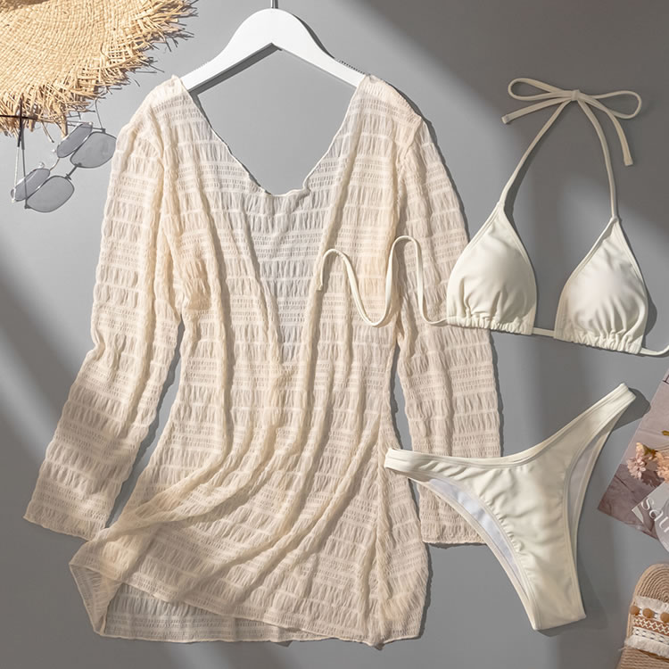 Step into elegance with this cream bikini set, featuring a classic triangle top and high-cut bottoms. The matching long-sleeve cover-up adds a touch of sophistication, making it perfect for those who want to feel both stylish and comfortable during their beachside moments.