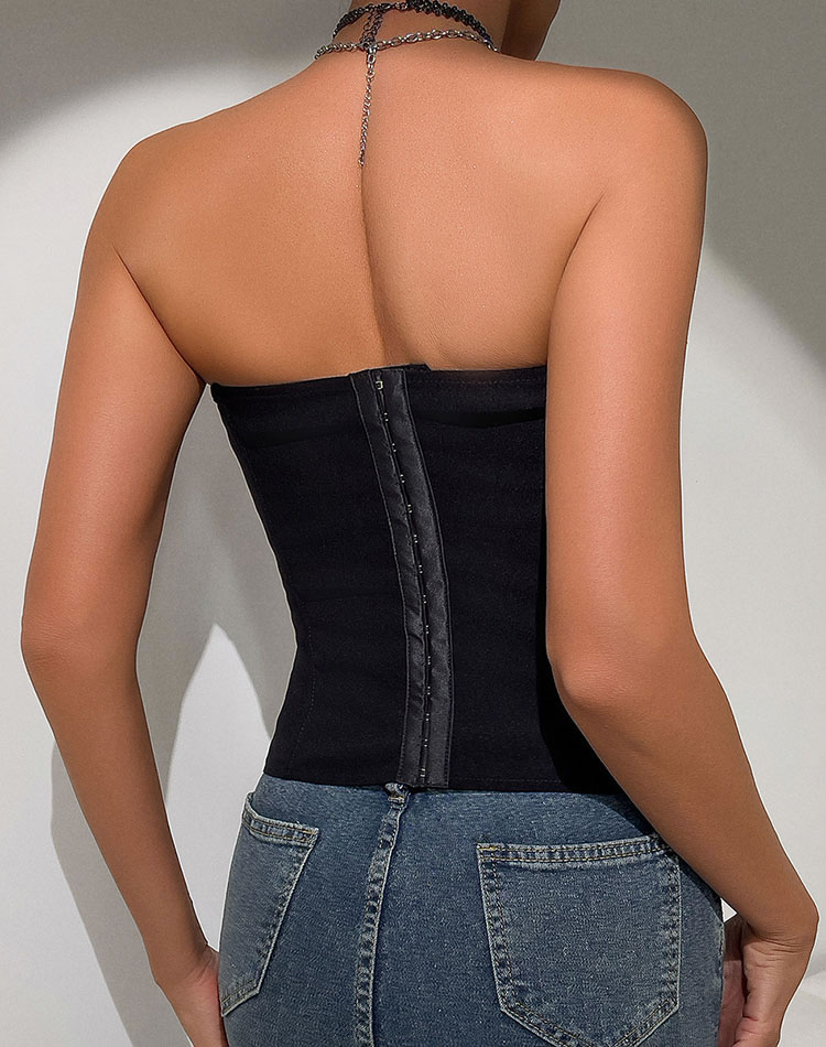 This sultry black corset top features a sweetheart neckline and a striking red tie, adding a bold and edgy touch to your outfit. The structured design provides support and shape, making it perfect for both formal events and casual outings.