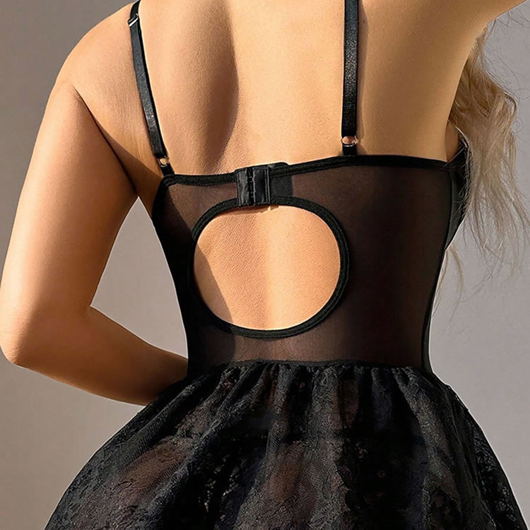 This bold black lingerie dress features a structured corset bodice with front lace-up detailing, soft cups, and adjustable tie straps. The flirty layered lace skirt adds movement and drama, while the sheer back cutout and garter straps complete this sultry, statement-making look.