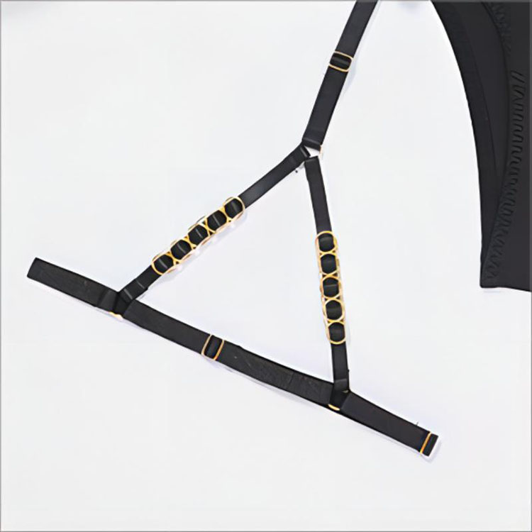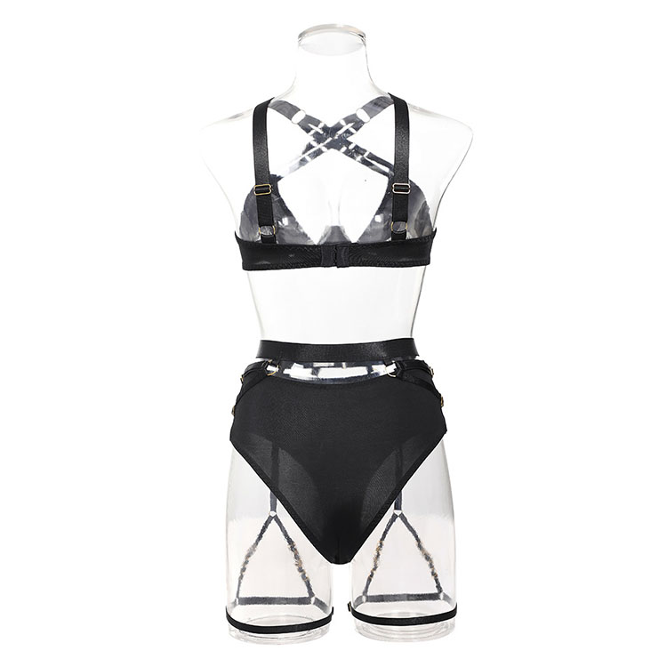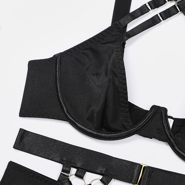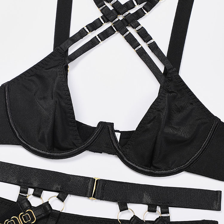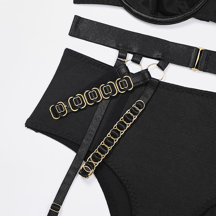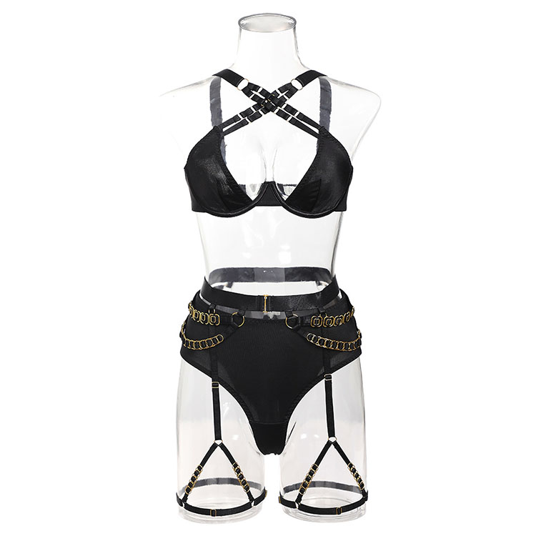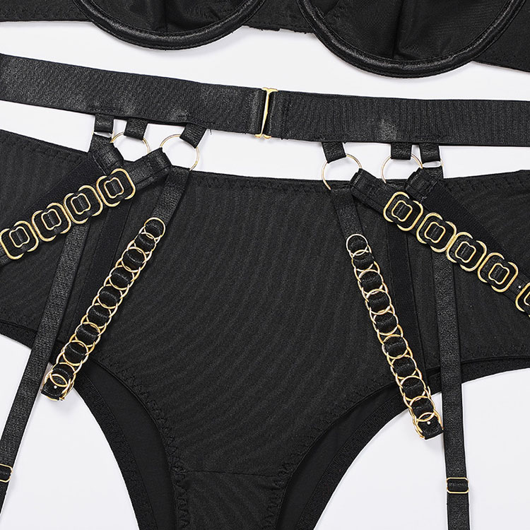 Elevate your allure with this stunning lingerie set, featuring a deep V-neck bra with intricate detailing and a high-waisted garter belt adorned with gold chains. The perfect blend of elegance and edge.