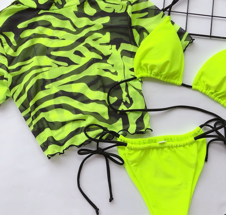 Stand out from the crowd in this exclusive bikini set featuring a sheer crop top with high neck, short sleeves, a string triangle cups bikini top, halter straps, a string tie back closure, and matching bikini bottom with side tie closures and a thong cut back.