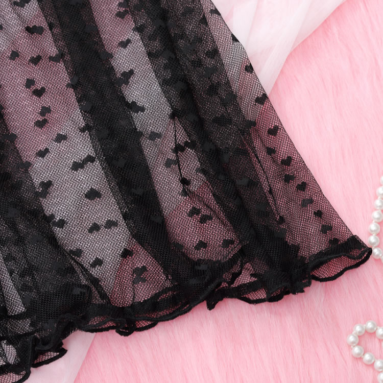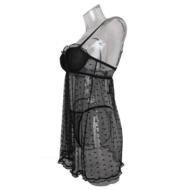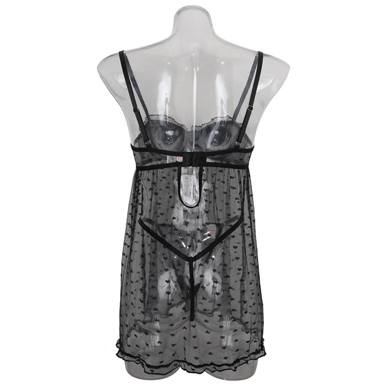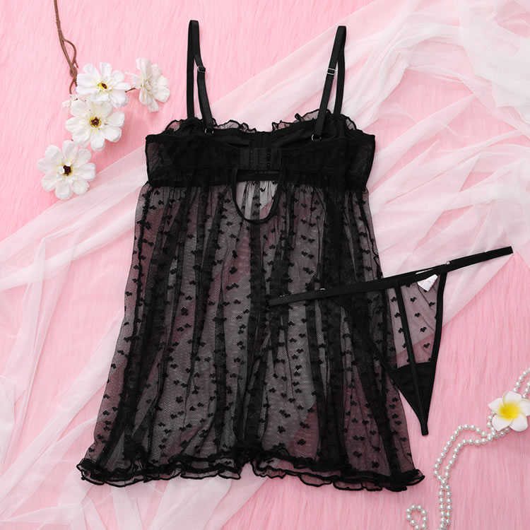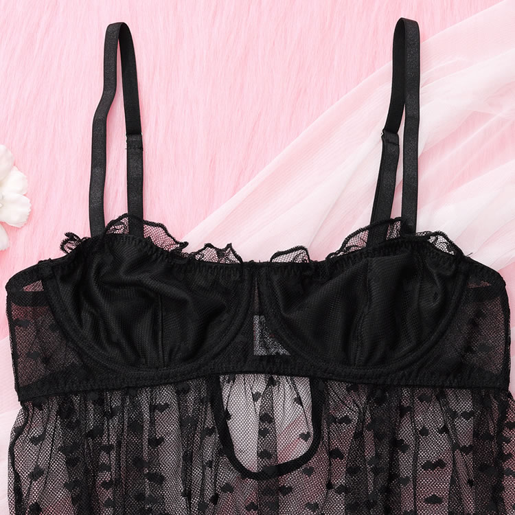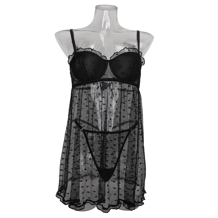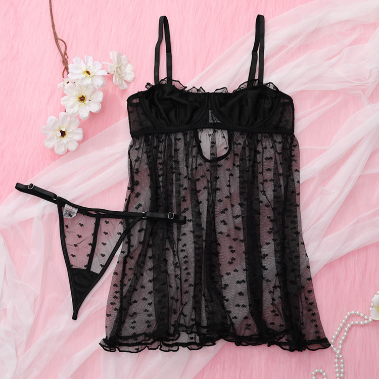 Spice up your late nights with this playful black babydoll set. Crafted from sheer mesh, this flirty ensemble features underwire for support, adjustable spaghetti straps, and a hook-and-eye back closure. Complete with a matching G-string panty, it's the perfect combination of sweet and sultry.