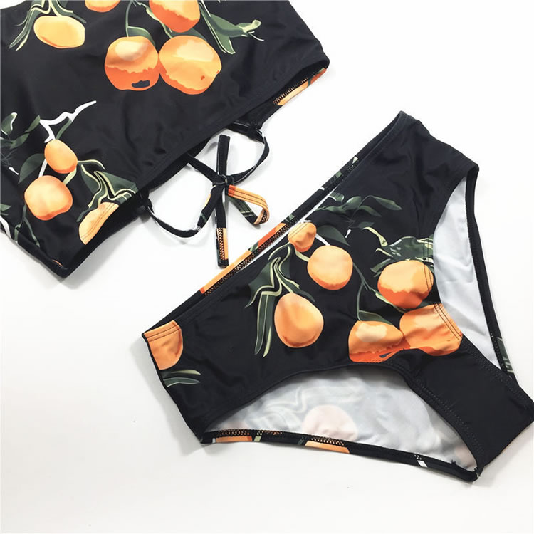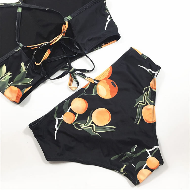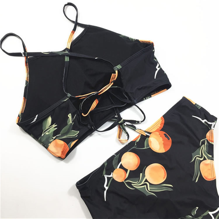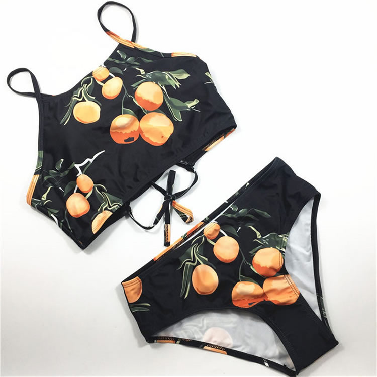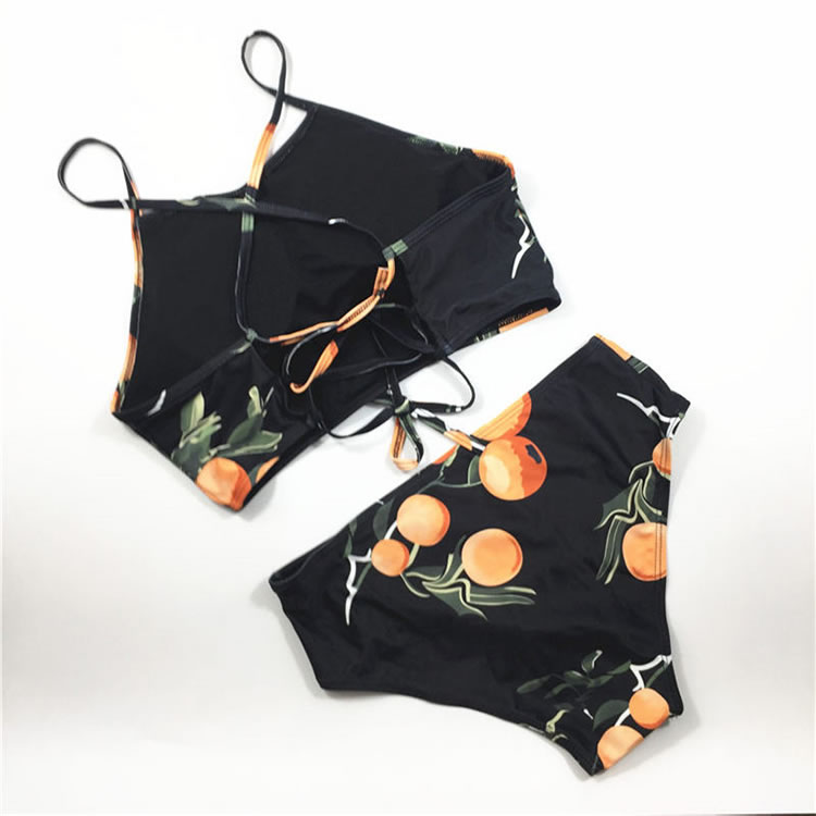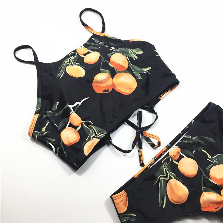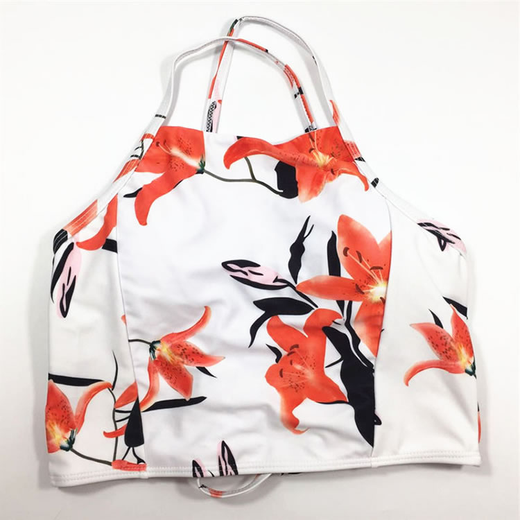 Turn heads at the beach in this sexy two piece set featuring a colorful printed design, a halter strap with a criss-cross back, a lace-up back, and matching bikini bottom with a high waist, a cheeky cut back.