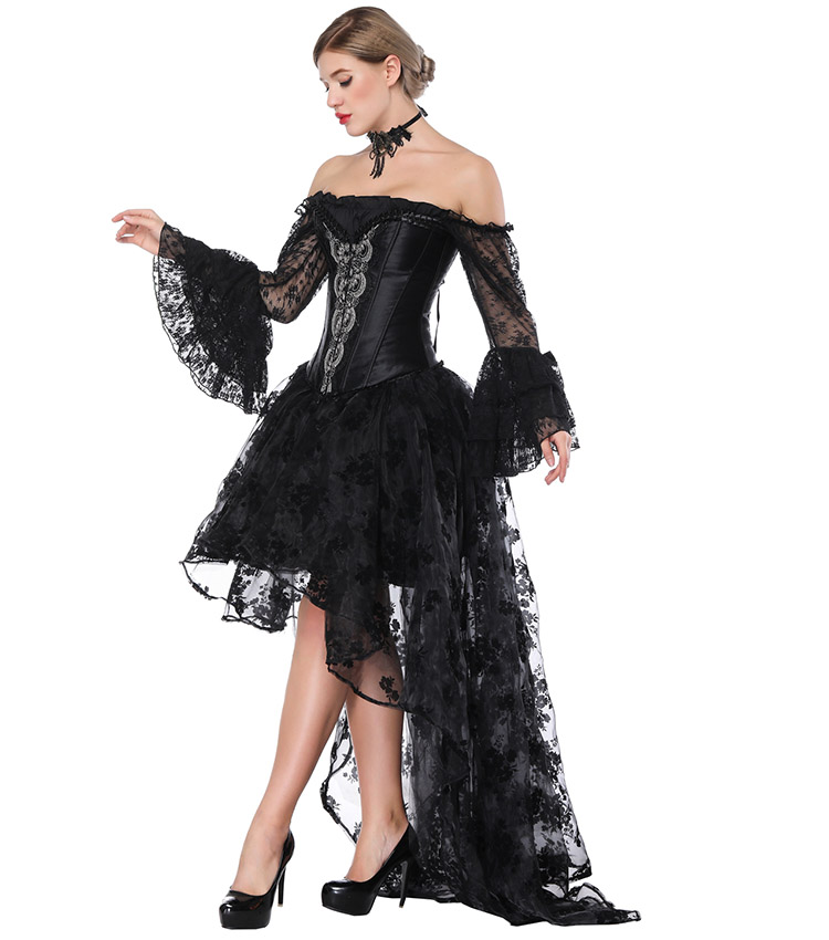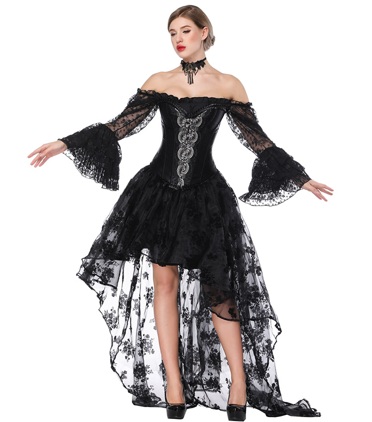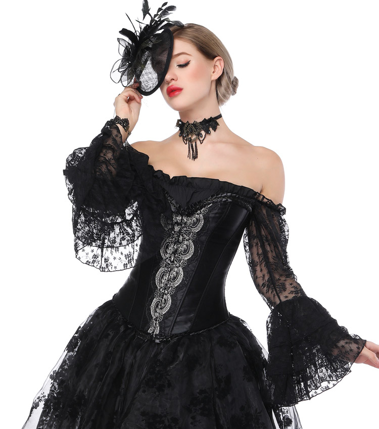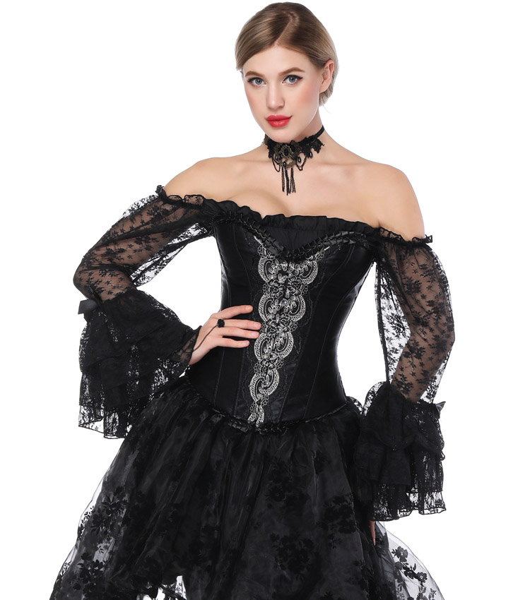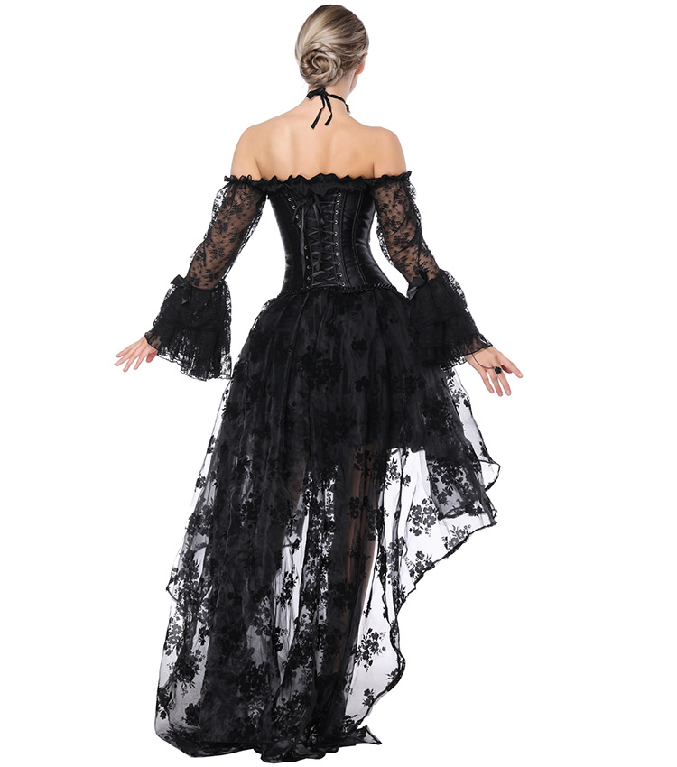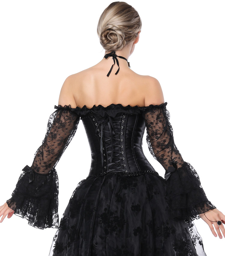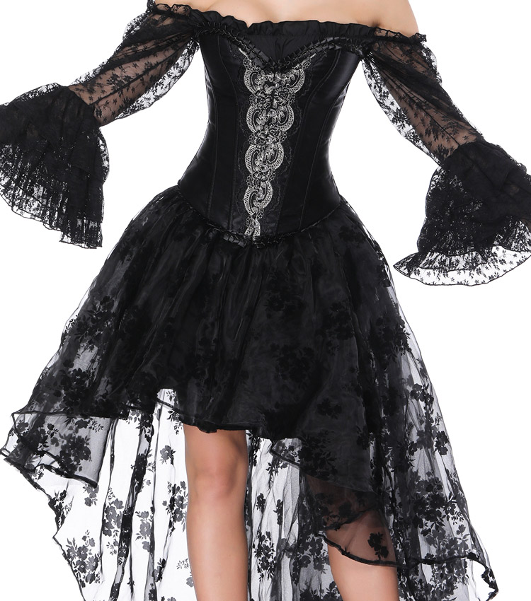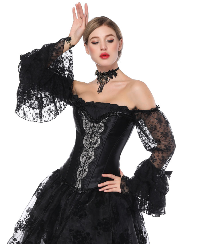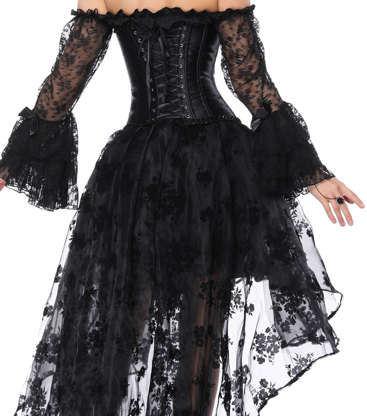 This floral lace corset features a sweetheart neckline with a ruffled trim, a dainty floral design, a front steel busk closure, a ruffled trim, and a lace-up back closure.
