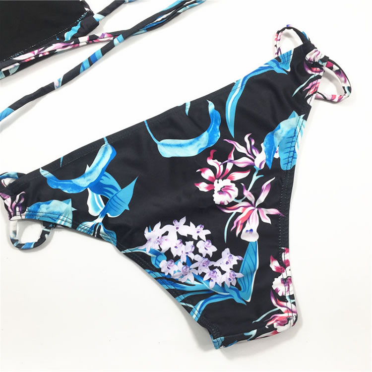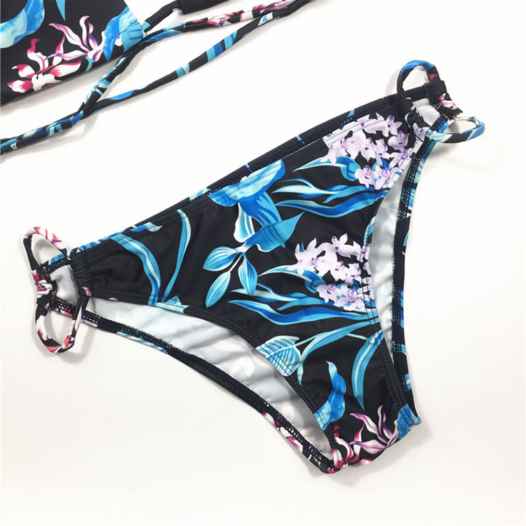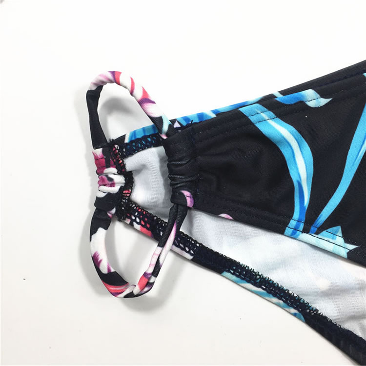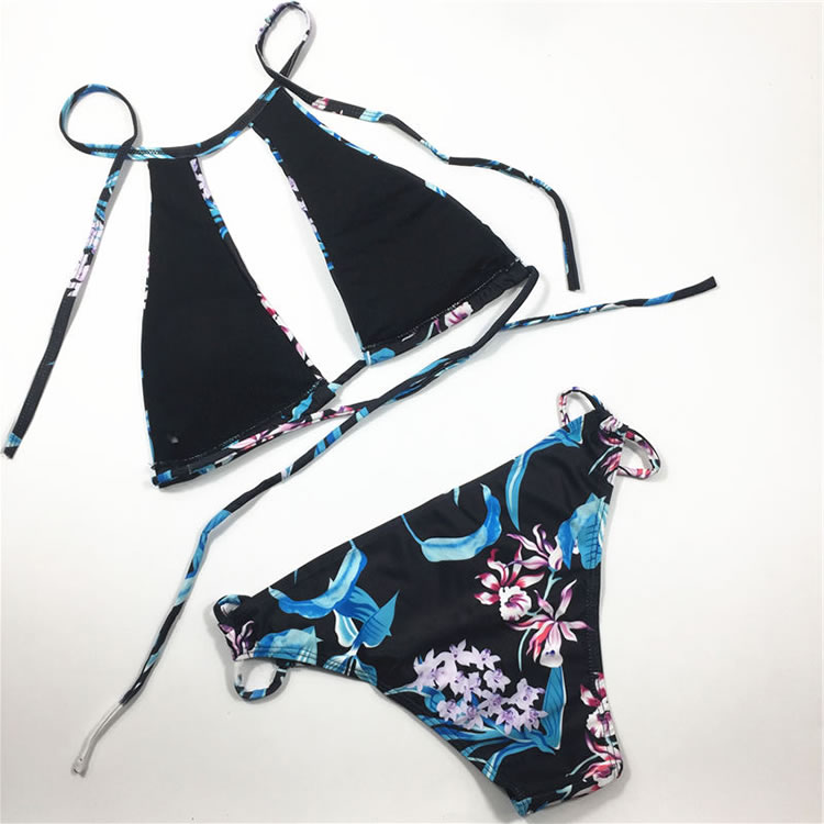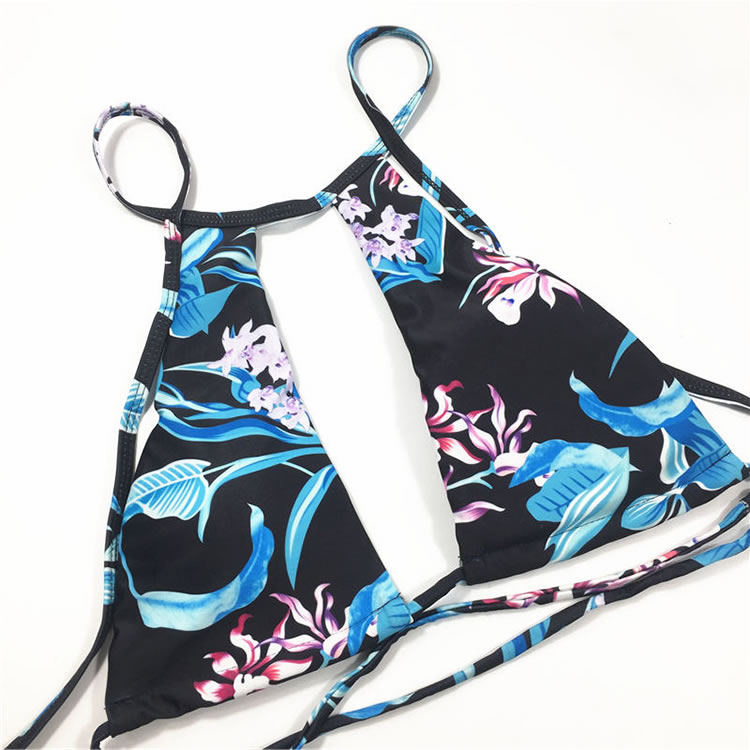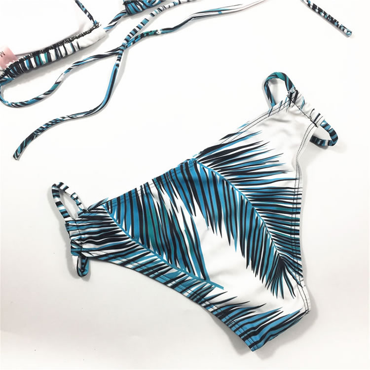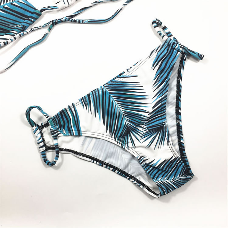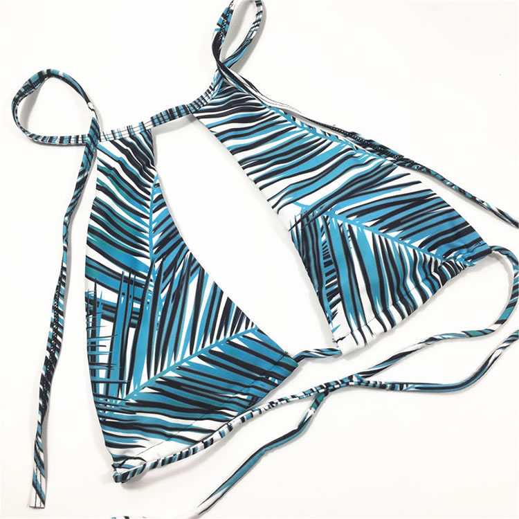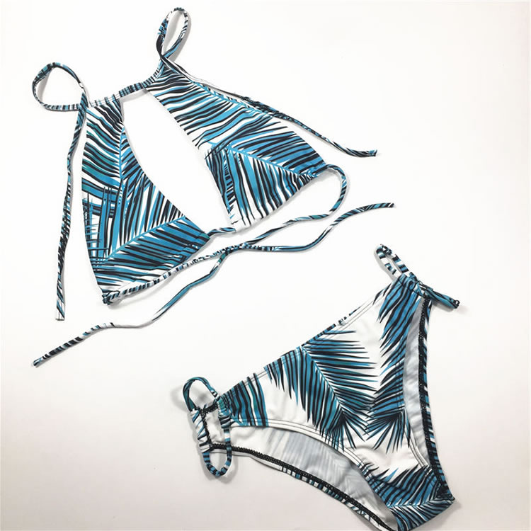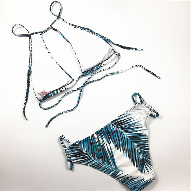 Flaunt your sun kissed curves in this sexy string bikini featuring adjustable triangle cups, halter straps, a tie back closure, an allover palm tree design, and a matching bikini bottom with dual strap sides and a cheeky cut back.