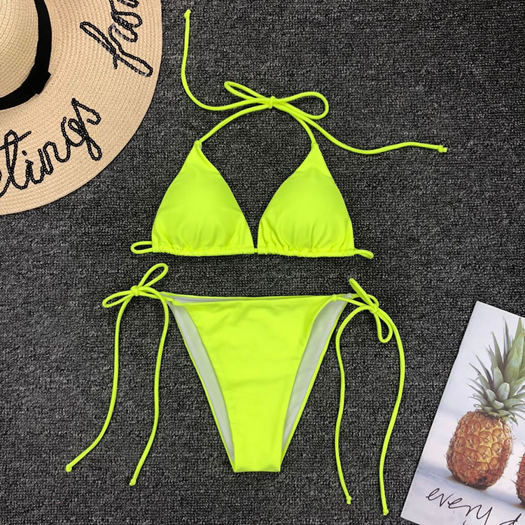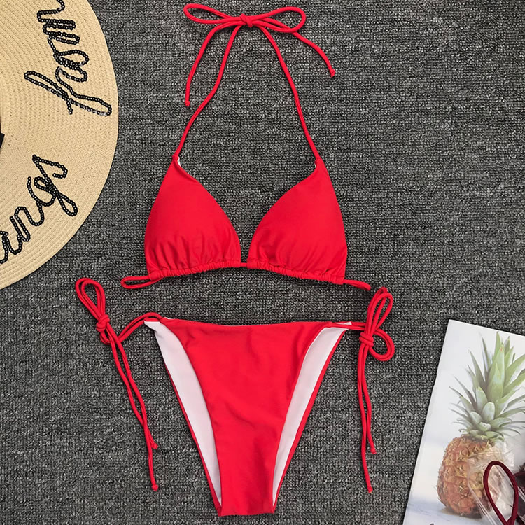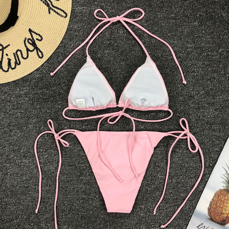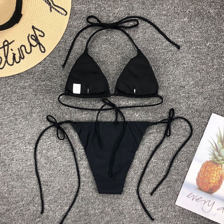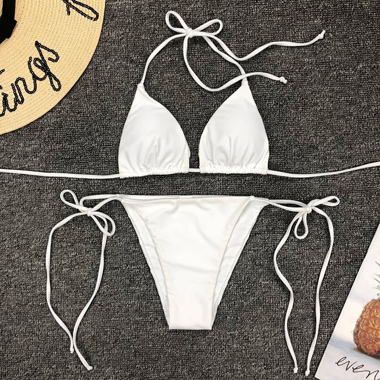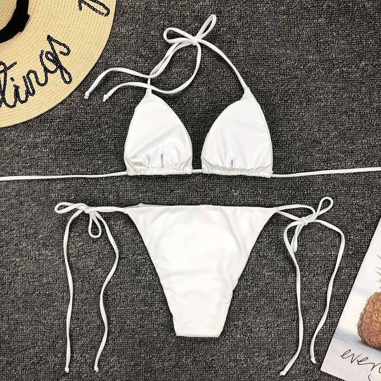 Dare to bare in this teeny bikini featuring string triangle cups, halter straps, a string tie back closure, and matching bikini bottom with side tie closures and a thong cut back.