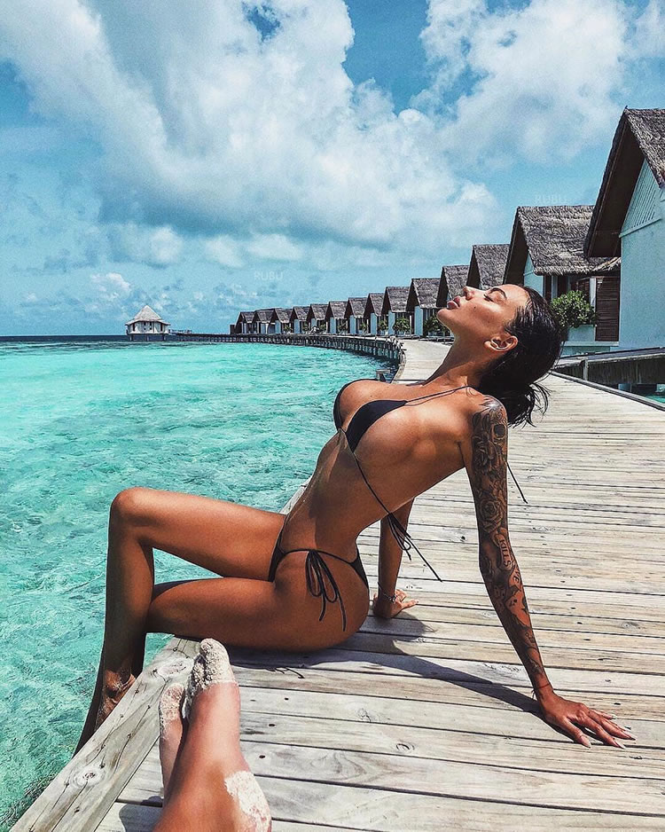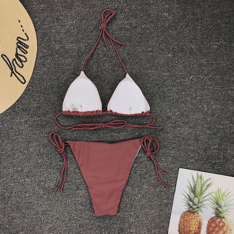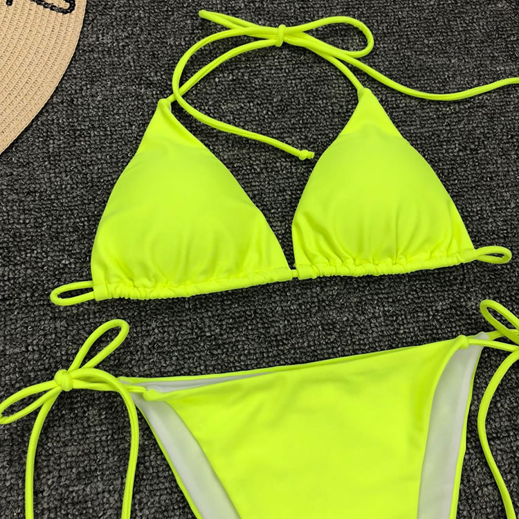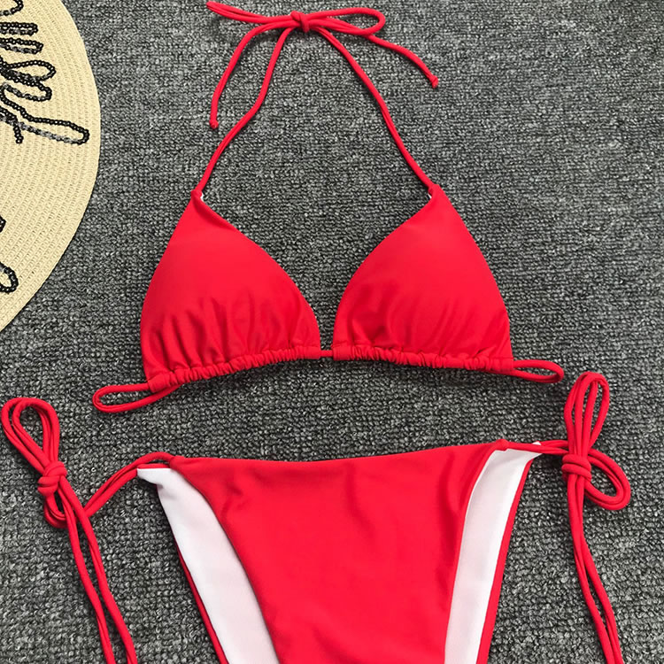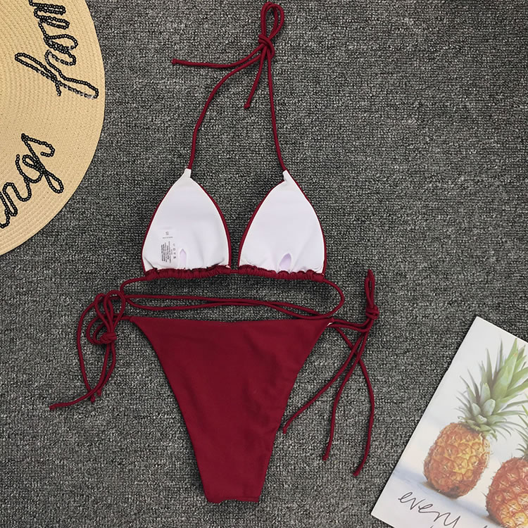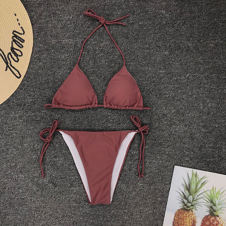 Dare to bare in this teeny bikini featuring string triangle cups, halter straps, a string tie back closure, and matching bikini bottom with side tie closures and a thong cut back.