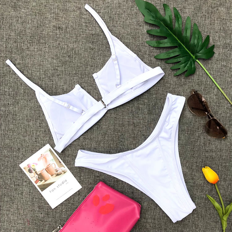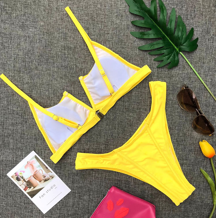 Make a splash in this exclusive swimwear featuring a scoop neckline, plunging V-shaped embellishments, adjustable spaghetti straps, a back hook closure, matching bottoms with a low cut front, high cut sides, a cheeky cut back.