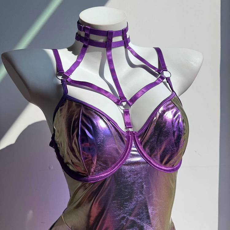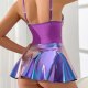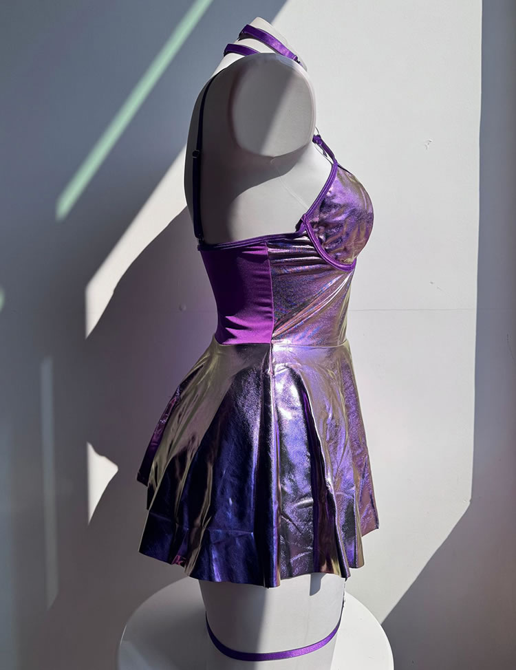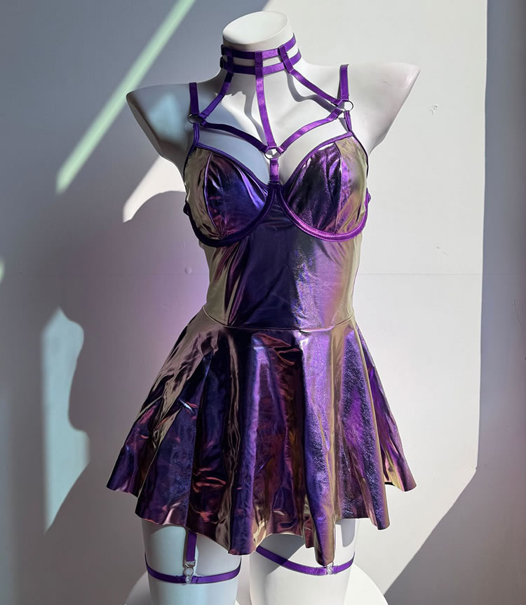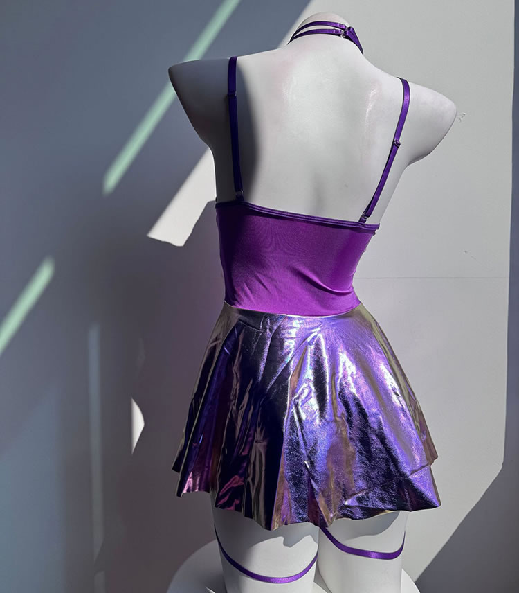 This eye-catching outfit combines a shiny, color-shifting fabric with a fun and flirty silhouette. The halter-style top features crisscross straps and metal rings that add an edgy touch, while the flared mini skirt creates a playful contrast. Paired with matching thigh straps, it’s designed to turn heads and make a statement—perfect for those who love to stand out.