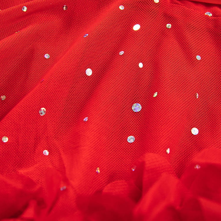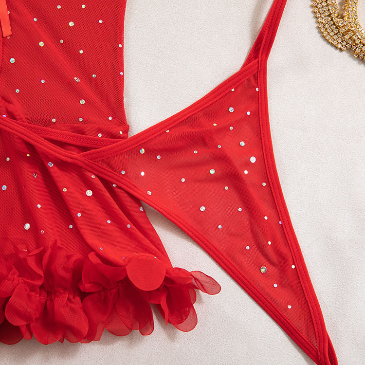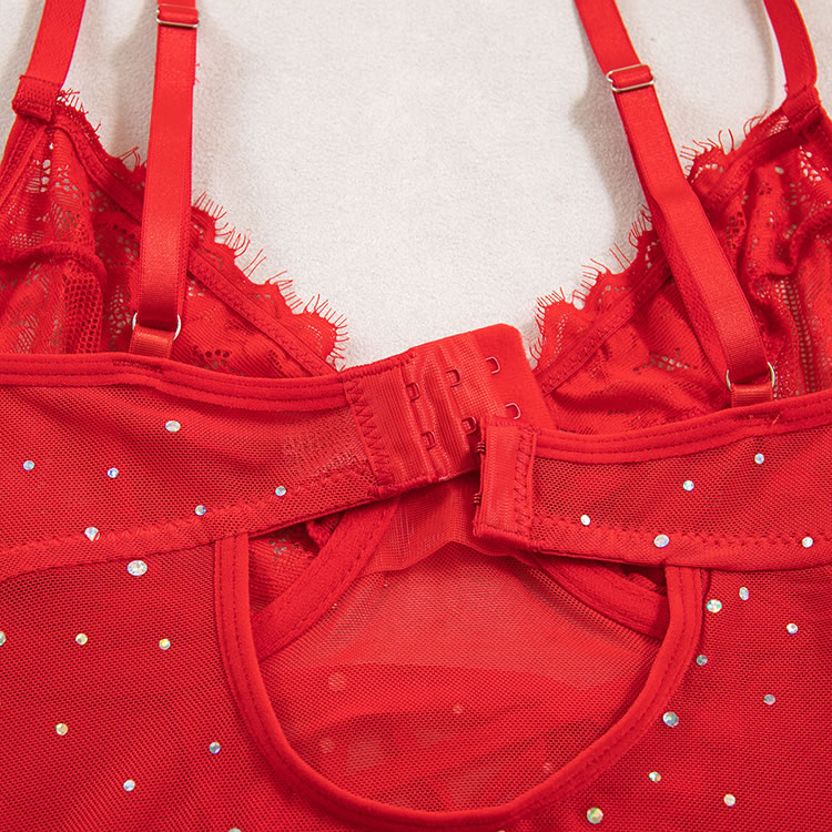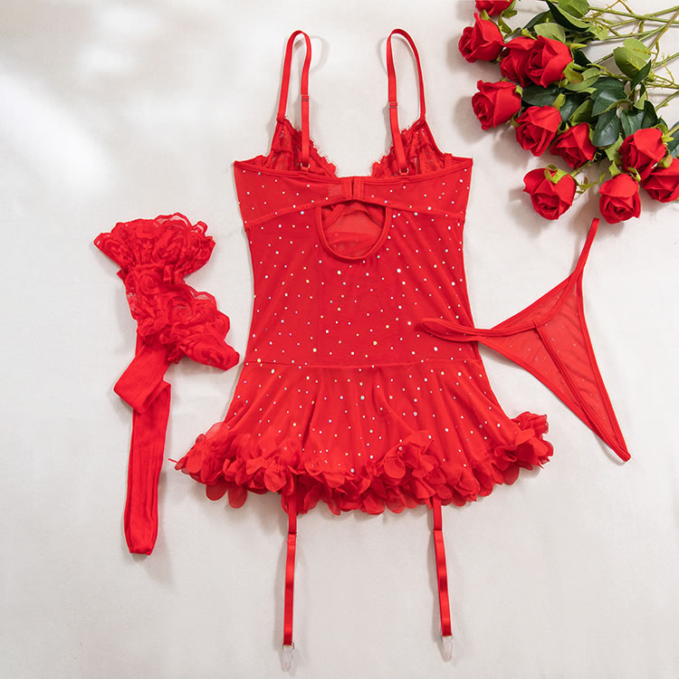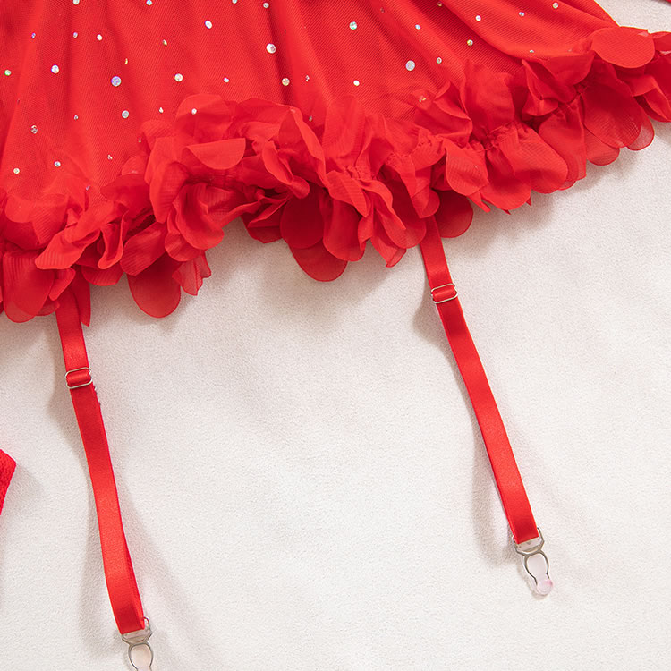 This bold red lingerie set features a corset-style bodysuit with lace-trimmed cups and a sweetheart neckline accented by a bow. The front includes crisscross lacing, adding structure and flair. A flared ruffle hem gives the piece a playful, dress-like silhouette. Adjustable garter straps connect to matching lace-edged thigh bands, designed to hold fishnet stockings securely. The back showcases an open cutout with a central clasp, enhancing the overall shape. Paired with red mesh tights, this outfit delivers a vibrant and expressive look perfect for special moments.