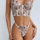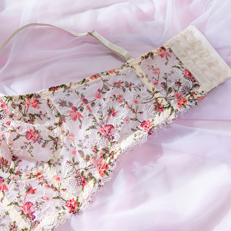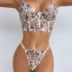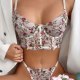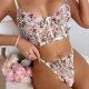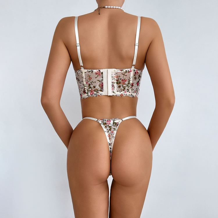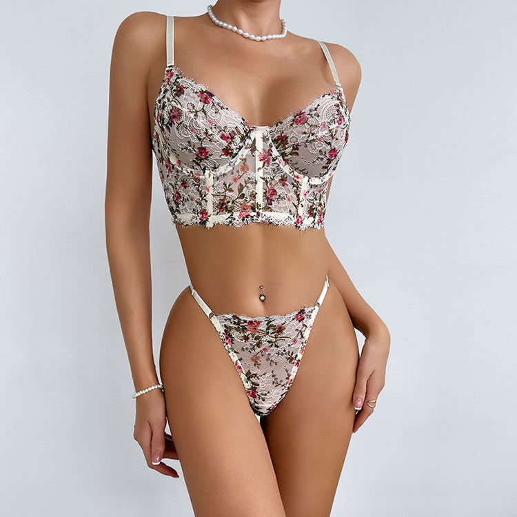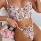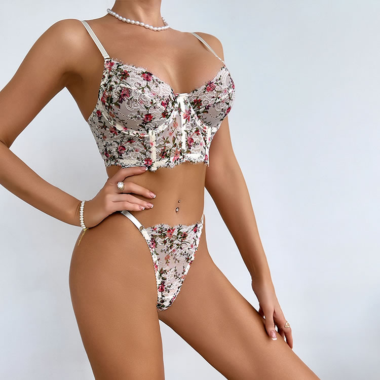 This floral lace lingerie set features a structured bra with a sheer mesh overlay adorned with delicate rose patterns. The matching thong has a minimal design with thin waistband and high-cut sides, offering a bold silhouette. Designed with adjustable straps and a back clasp closure, it balances support and style for everyday wear or special moments.