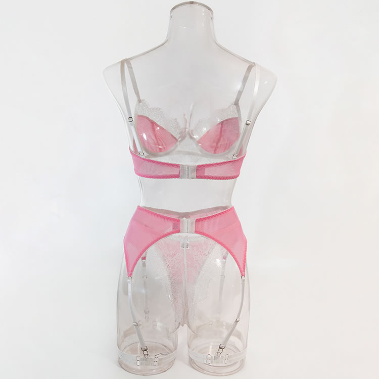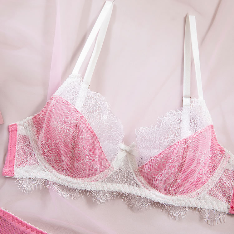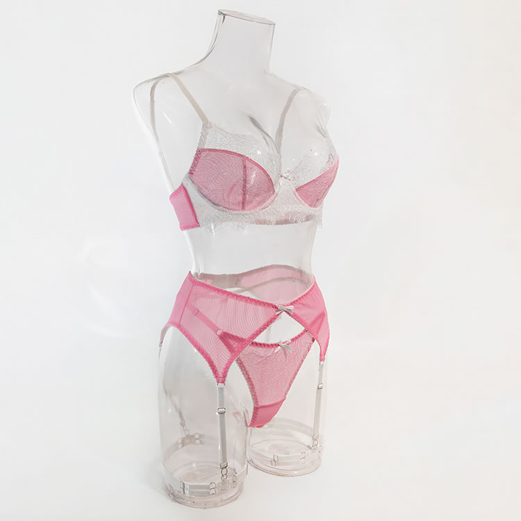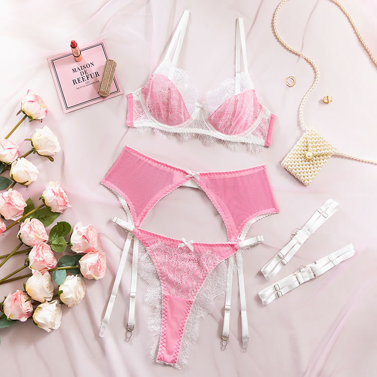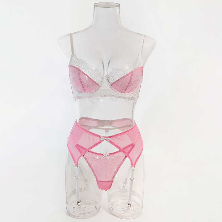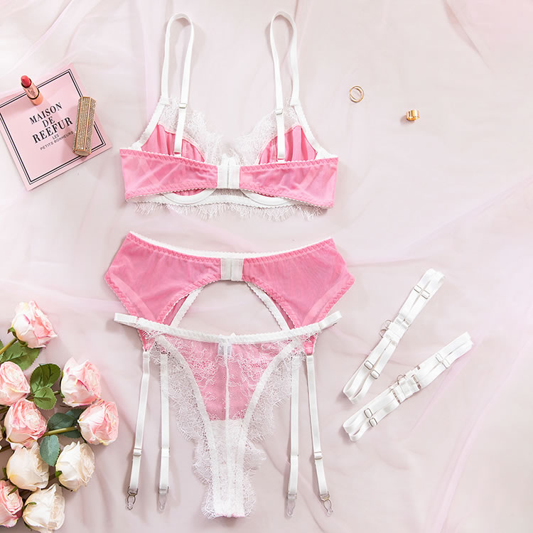 Step into a world of playful seduction with this charming pink and white lingerie set. The bra features a soft, sheer mesh cup design with delicate lace trim and a scalloped edge, offering a gentle, romantic support. The matching sexy panty is designed with a cheeky cut and sheer mesh fabric, accented by a cute bow at the front. The set is completed with white garters and thigh straps, adding a vintage-inspired touch to the modern silhouette. Perfect for those who love a mix of sweet and daring styles.