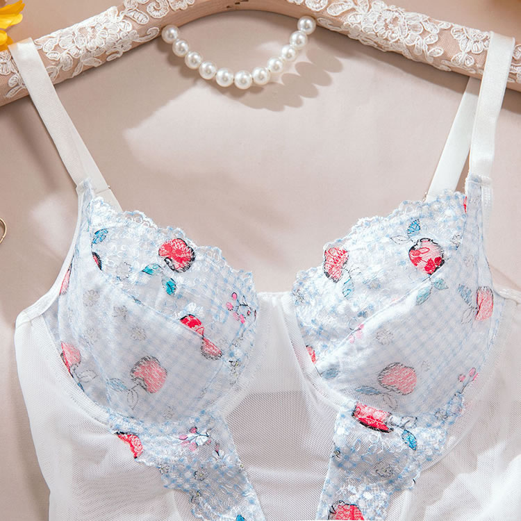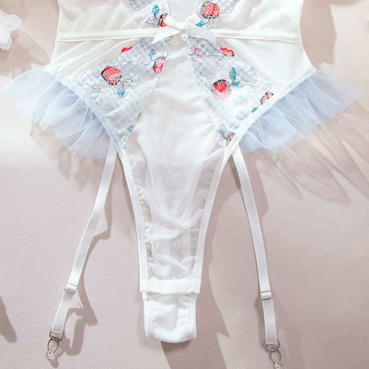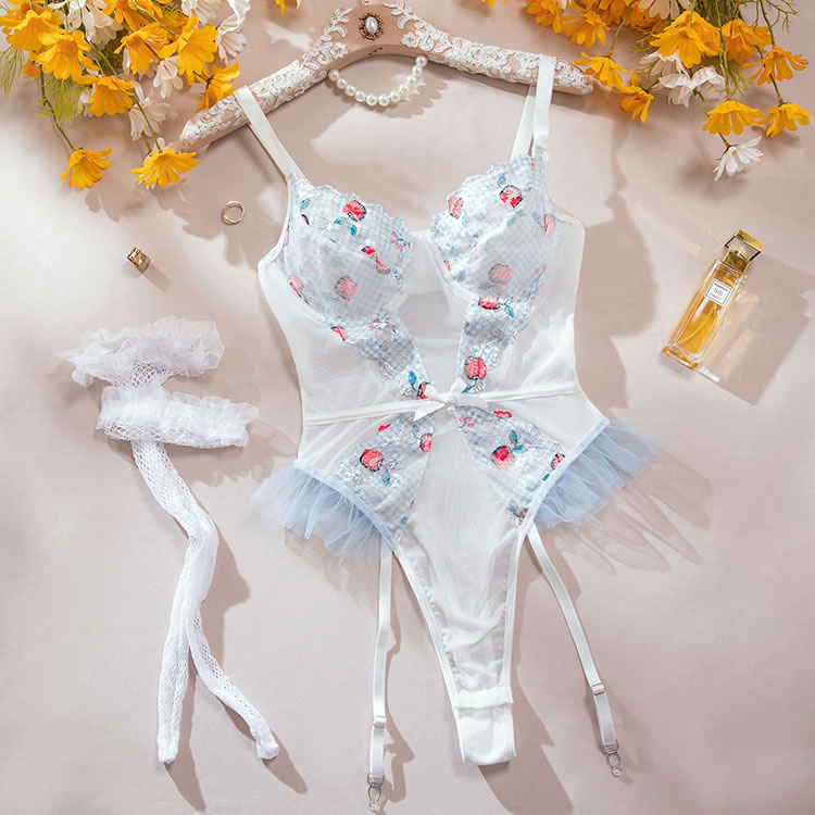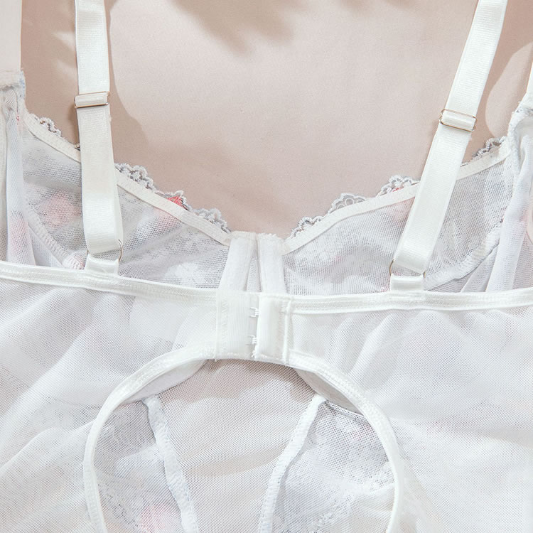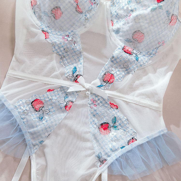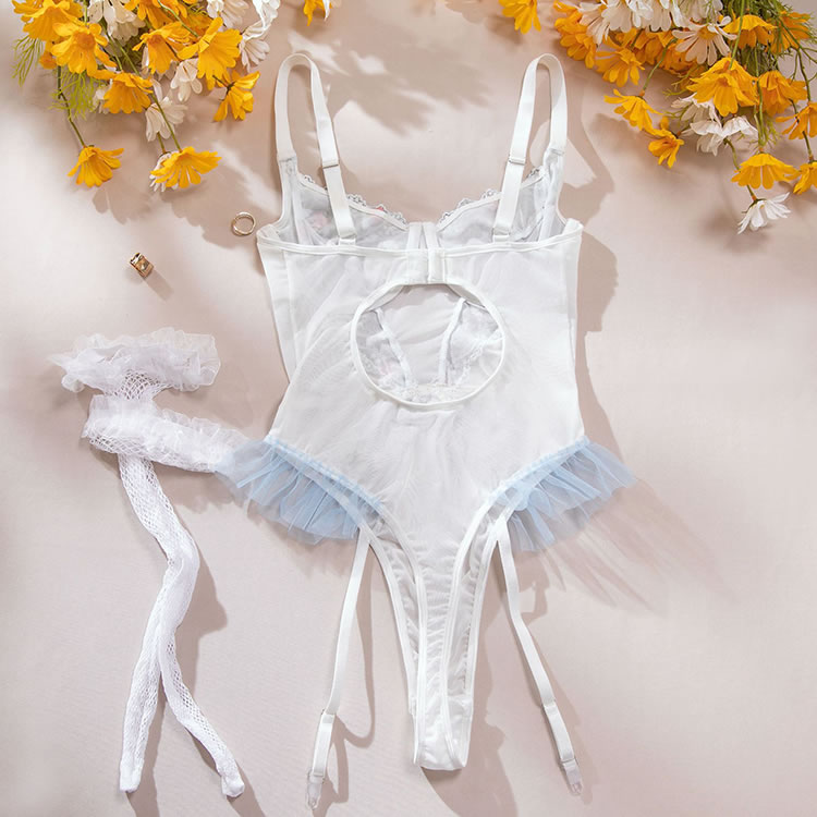 Combining soft mesh with floral lace and fruit-themed prints, this lingerie bodysuit offers a fun and flirty look. The structured bust area provides support, while the high-cut legs and open back highlight curves with confidence. Paired with ruffled edges and matching garters, it's styled to be both eye-catching and comfortable—ideal for special occasions or expressive fashion moments.