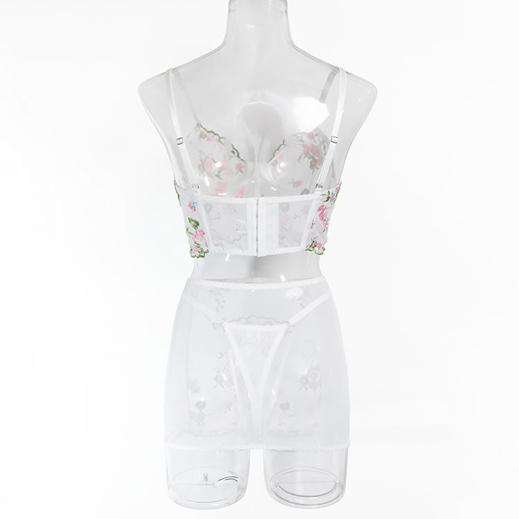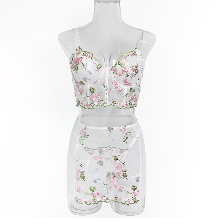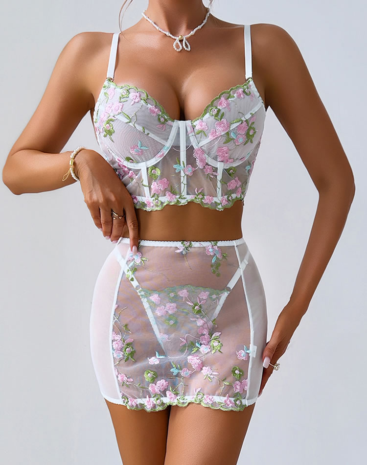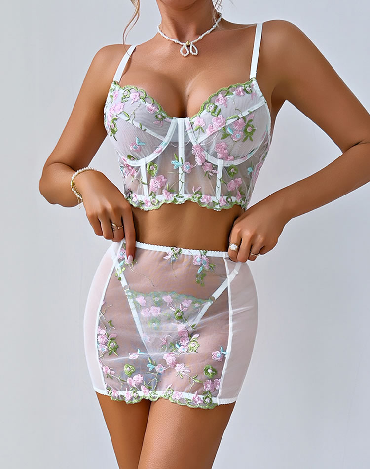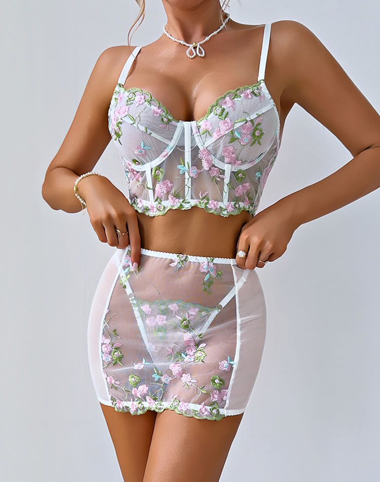 This feminine lingerie costume combines soft transparency with romantic floral details for a dreamy, eye-catching look. The cropped corset-style top features thin shoulder straps, vertical boning, and embroidered pink and green flowers that add a touch of nature-inspired charm. Paired with a matching high-waisted sheer mini skirt, it creates a cohesive silhouette that’s both playful and sensual. The skirt hugs the hips with a fitted cut and subtle lace trim, making this set perfect for intimate moments or themed events.