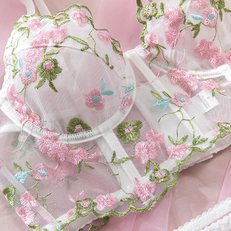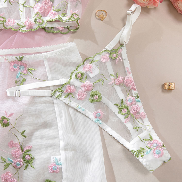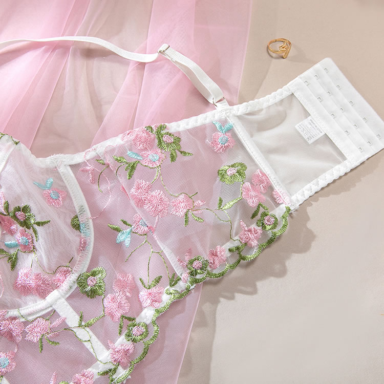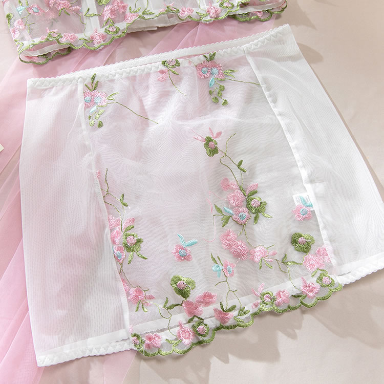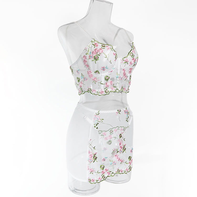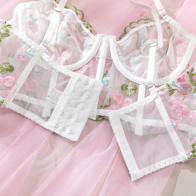This feminine lingerie costume combines soft transparency with romantic floral details for a dreamy, eye-catching look. The cropped corset-style top features thin shoulder straps, vertical boning, and embroidered pink and green flowers that add a touch of nature-inspired charm. Paired with a matching high-waisted sheer mini skirt, it creates a cohesive silhouette that’s both playful and sensual. The skirt hugs the hips with a fitted cut and subtle lace trim, making this set perfect for intimate moments or themed events.