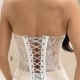 This elegant strapless bustier is crafted from delicate floral lace over a sheer mesh base, creating a romantic and alluring look. The structured bodice features a sweetheart neckline with a raw, frayed lace edge for a touch of modern texture. It cinches the waist to create a classic hourglass shape, while the back is secured with a traditional crisscross lace-up closure, allowing for an adjustable and comfortable fit. Perfect for adding a sophisticated yet daring element to any outfit.