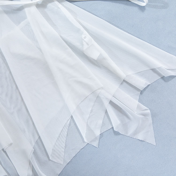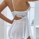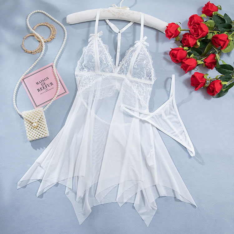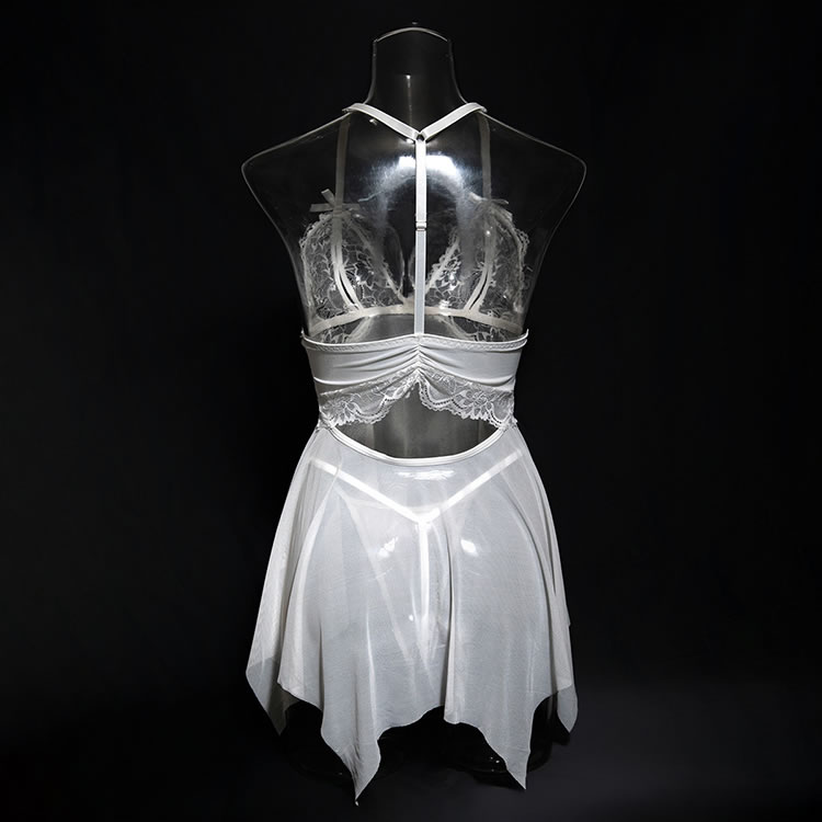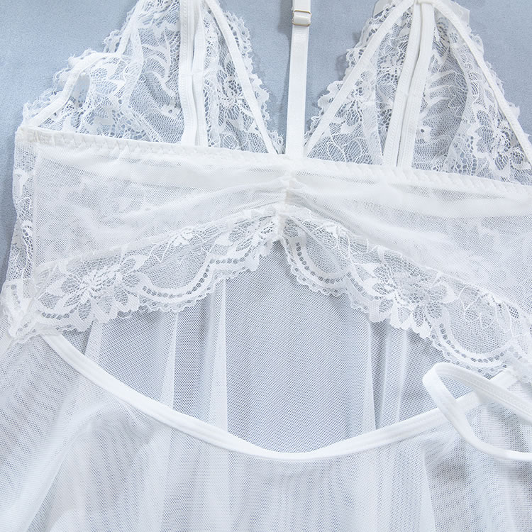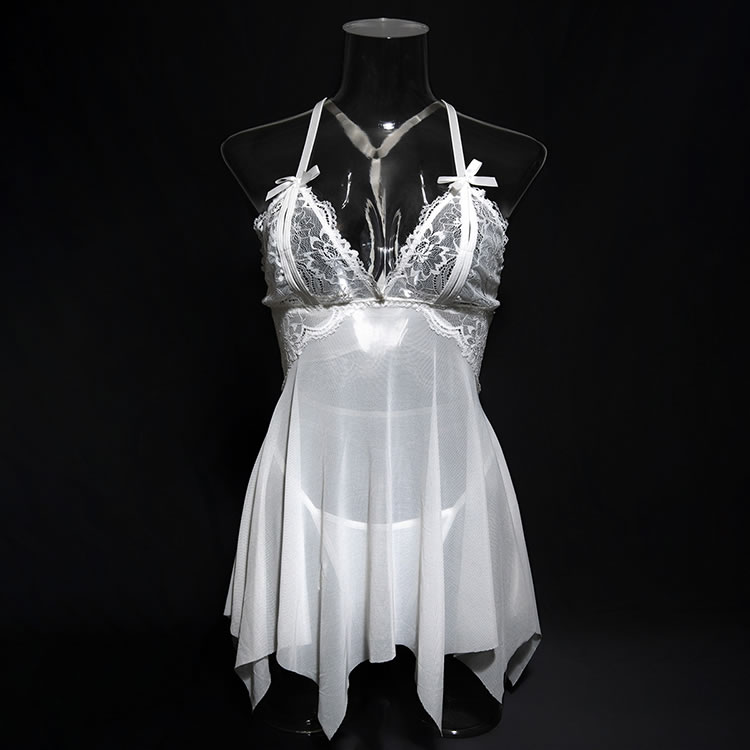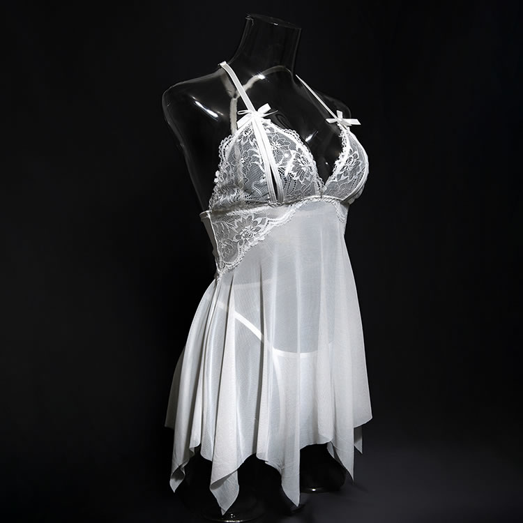 This delicate white lingerie dress features a halter neckline with adjustable straps and bow detailing at the front, offering both comfort and flair. The top is crafted with floral lace panels that frame the bust, while the sheer mesh fabric adds a soft, airy feel. A cutout at the waist enhances the silhouette, and the asymmetrical hemline gives it a modern edge. Perfect for intimate moments or romantic occasions, this piece blends femininity with bold design.