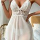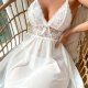 This delicate white lingerie dress features a deep V-neckline with intricate floral lace detailing across the bust and waistband. A small bow at the center adds a sweet touch, while thin spaghetti straps offer a graceful look. The sheer, flowing skirt gently flares from the waist, creating a soft and airy silhouette. Perfect for intimate moments or lounging in style, it blends elegance with comfort.