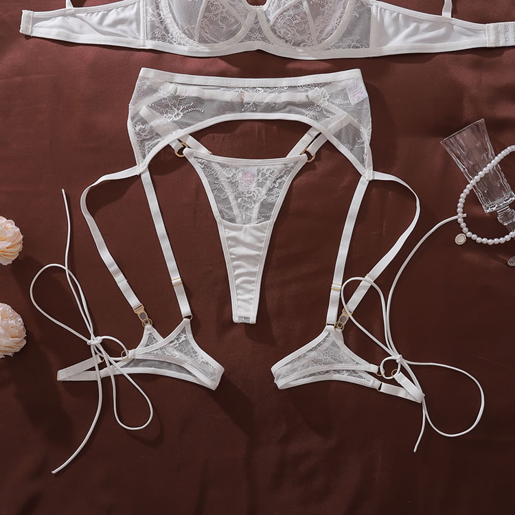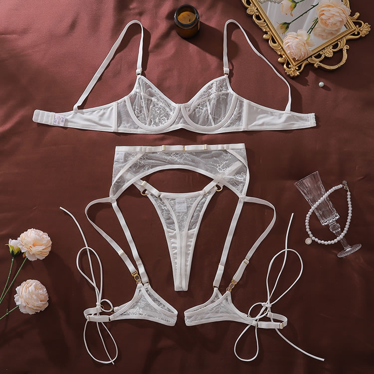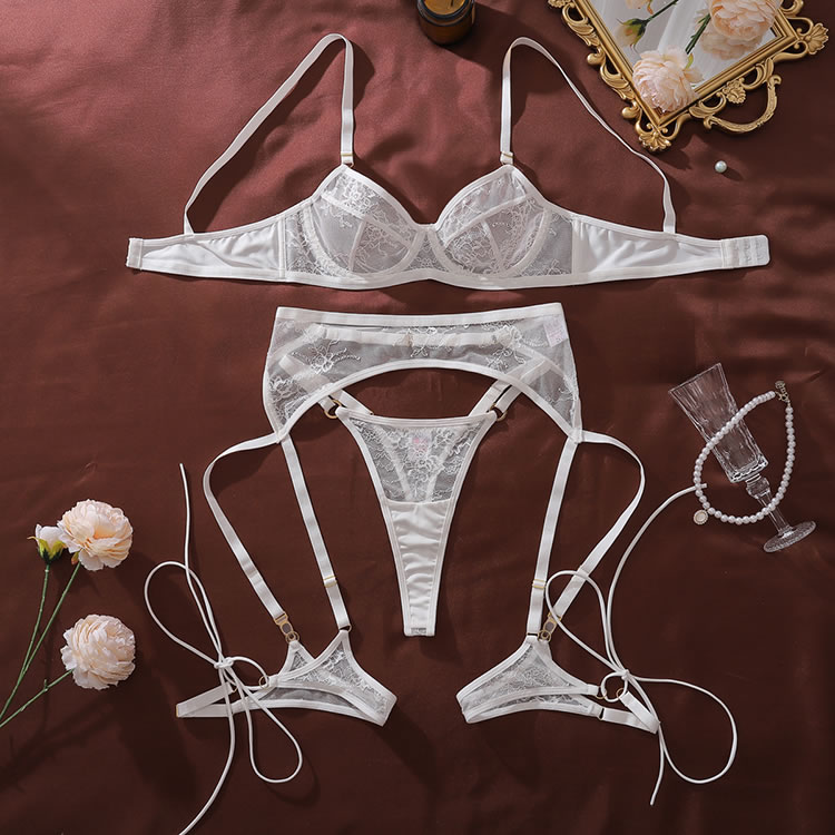 Elevate your boudoir collection with this sheer mesh lingerie set featuring intricate floral embroidery accents. The delicate adjustable straps bra offers a romantic, feminine silhouette, while the matching adjustable garter belt and thigh straps add a touch of vintage-inspired allure. Designed for comfort and confidence, this set combines soft textures with eye-catching details, making it perfect for special occasions or adding a hint of glamour to your everyday routine.