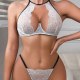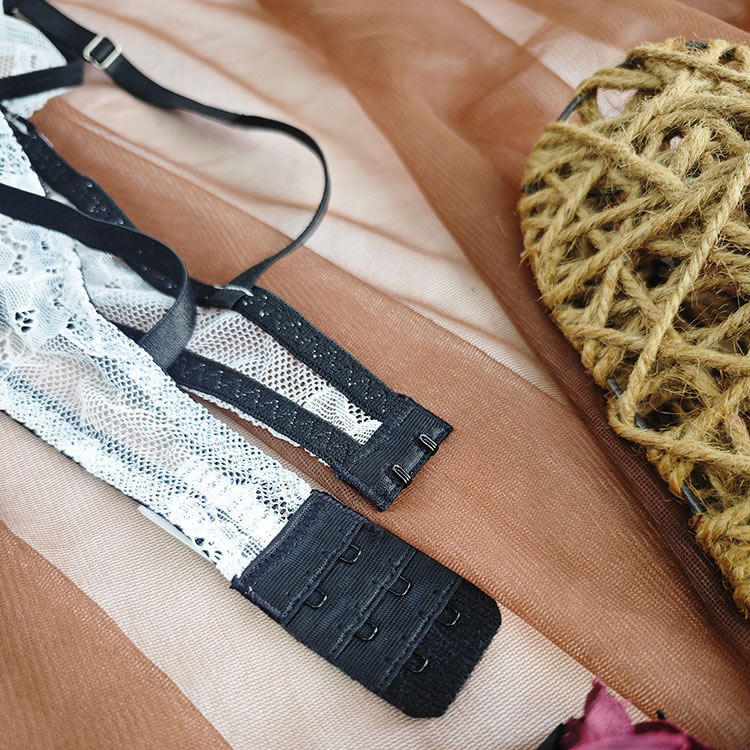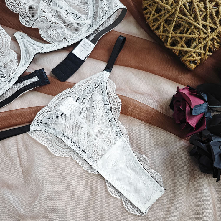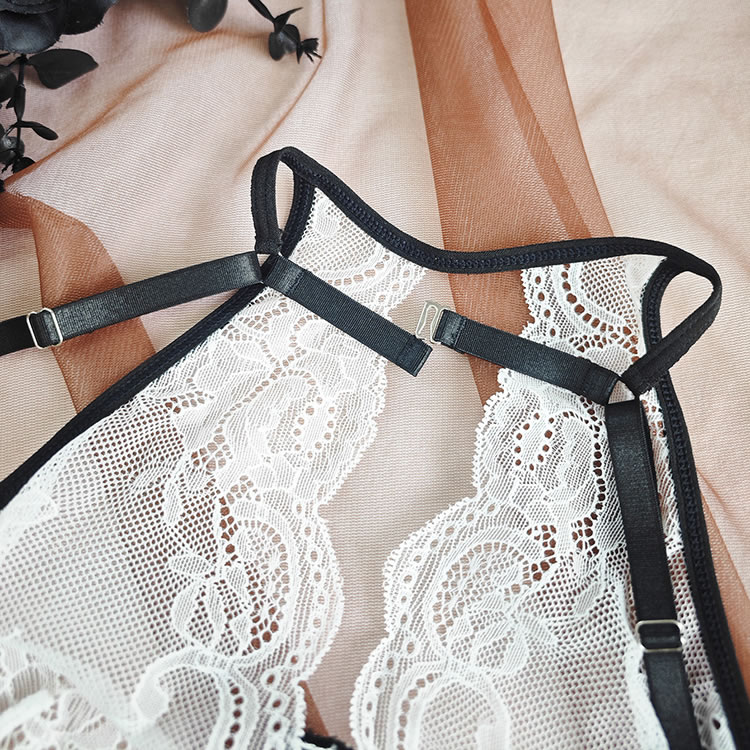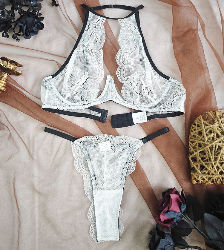 This white lace lingerie set features a halter-style bra with delicate floral patterns and thin black trim along the edges. The top has a deep V-neckline and a high neckband that wraps around the back, creating a secure and elegant fit. Adjustable straps at the back allow for customization, while the sheer mesh fabric adds a soft contrast to the solid lace. Paired with matching thong bottoms that have a triangle cut and scalloped lace detailing, this set offers a balanced blend of coverage and openness.