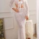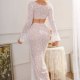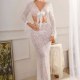 This elegant white lace lingerie set features a long-sleeve crop top with flared cuffs and a deep V-neckline tied with a delicate bow at the center. The matching high-waisted skirt hugs the figure with a sleek, floor-length silhouette, creating a graceful and romantic look. A cutout at the midriff adds a touch of boldness, while the floral lace pattern enhances its feminine charm. Perfect for special moments or adding a dreamy vibe to intimate evenings.
