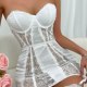 This bold lingerie set combines sleek satin with delicate lace detailing for a striking silhouette. Featuring a sweetheart neckline, structured bustier design, and side lace panels, it flatters the figure with confidence. The back includes an elegant open cutout and adjustable straps for a personalized fit. Paired with matching garters, this piece is perfect for those who love a daring, feminine look with a touch of vintage charm. (Thigh high stockings not included.)