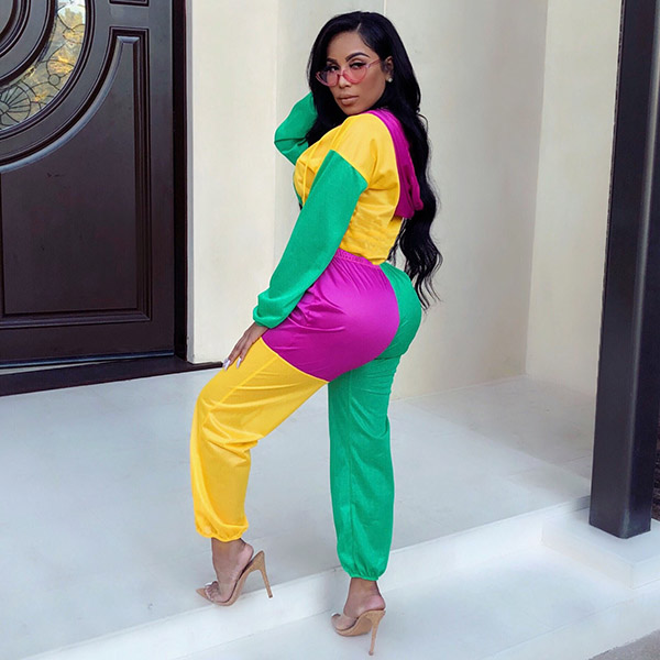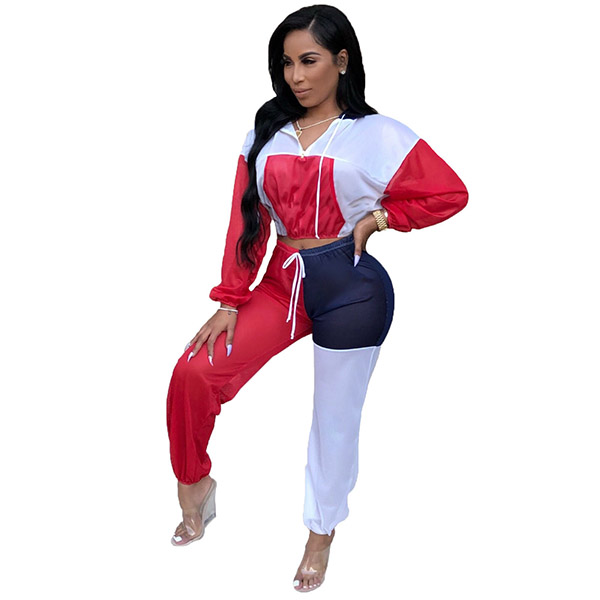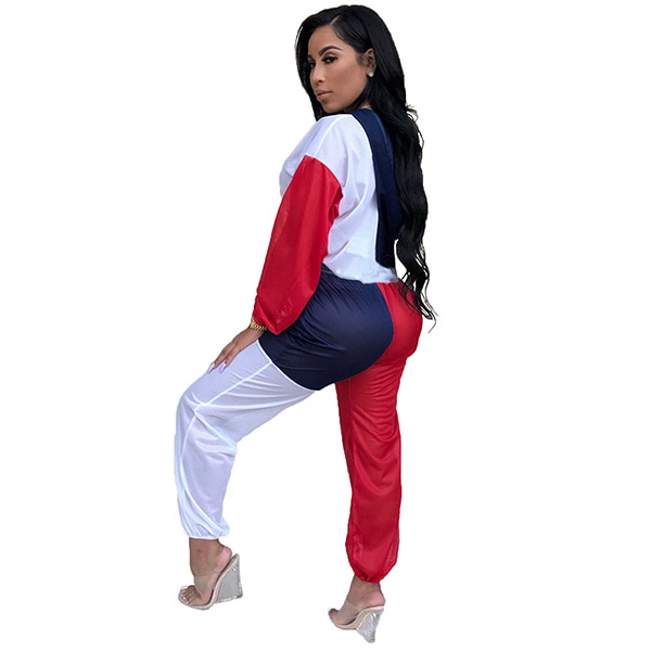 • Womens 2pcs Outfits Color Block Top Shirts + Long Pants Club Sports Suit