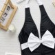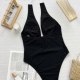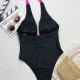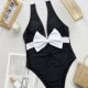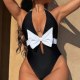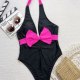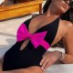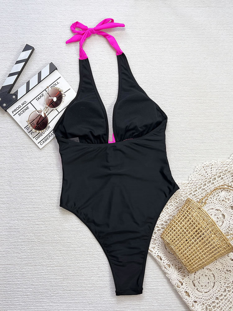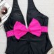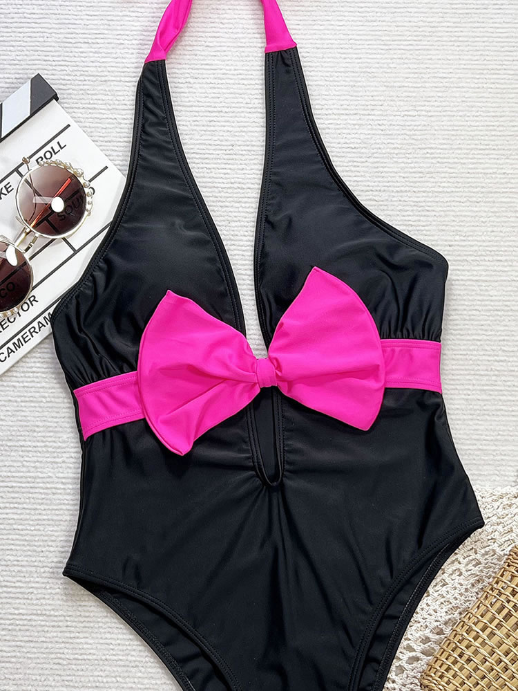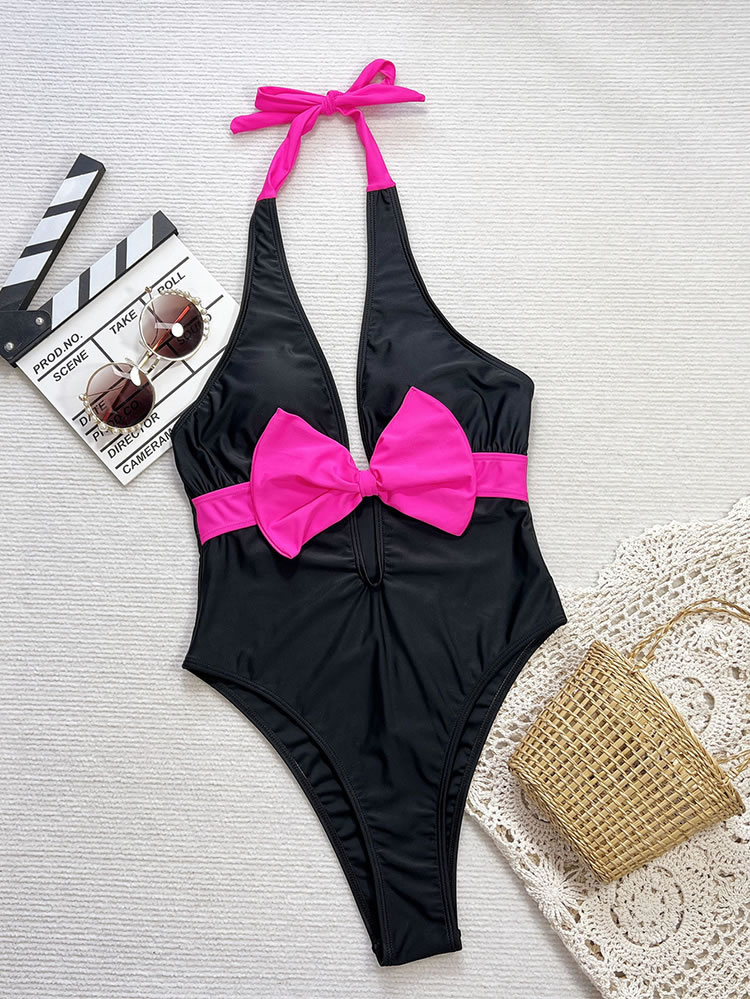 Make a splash this summer with this eye-catching one-piece swimsuit. Designed for the fashion-forward beachgoer, it features a striking black base contrasted by a vibrant neon pink bow at the bust and matching halter ties. The deep plunging V-neckline adds a touch of allure, while the high-cut leg openings elongate the silhouette for a flattering fit. Perfect for sunbathing by the pool or a day at the beach, this suit combines retro charm with modern style.