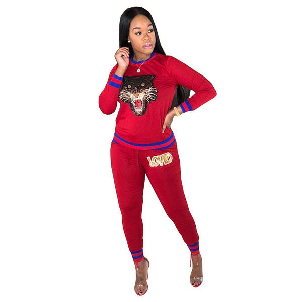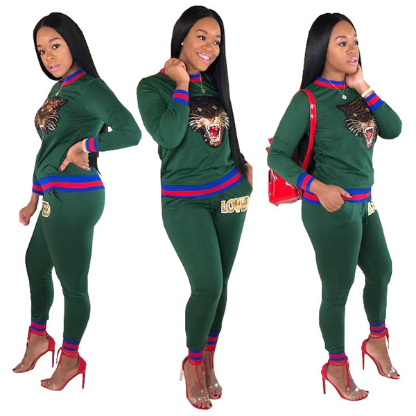 Women's Outfits Long Sleeve Sequin Tiger Print Top + High Waist Bodycon Long Pants