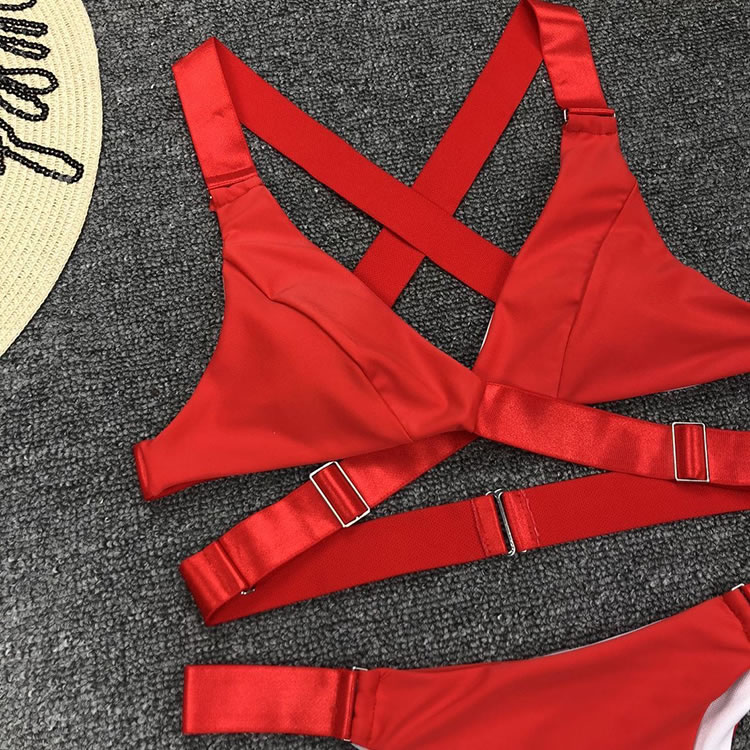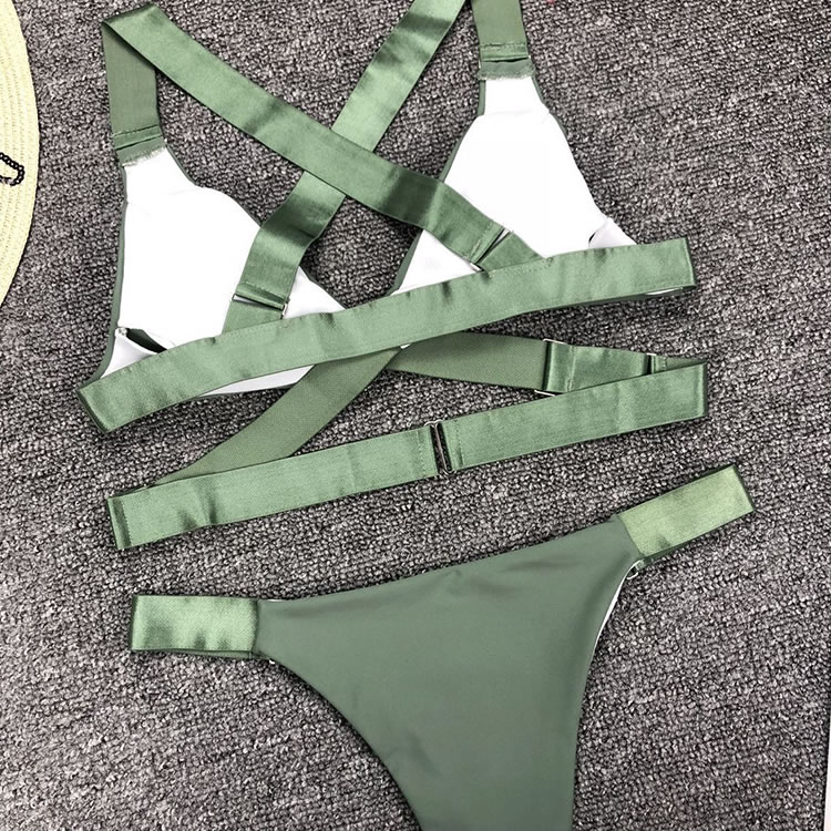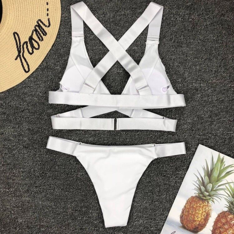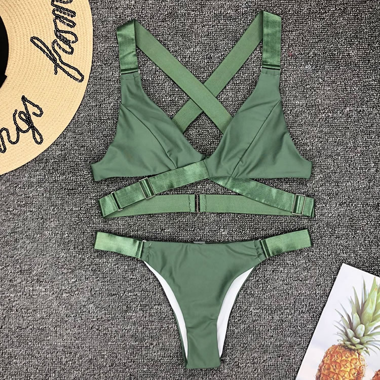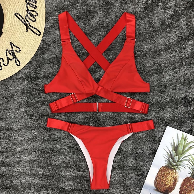 Get all wrapped up in this bikini set featuring a solid padded cups, a halter strap with a criss-cross back, a wrapped underbust band, a slid closure on the back, and a matching bottom with strappy sides, and high cut sides, a thong cut back.