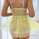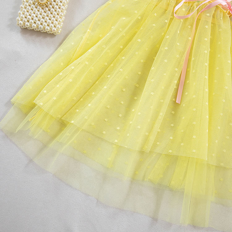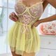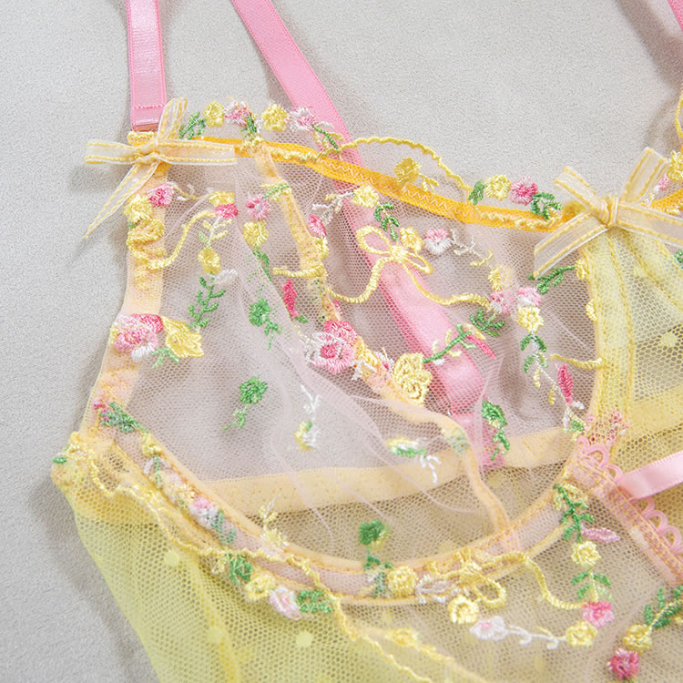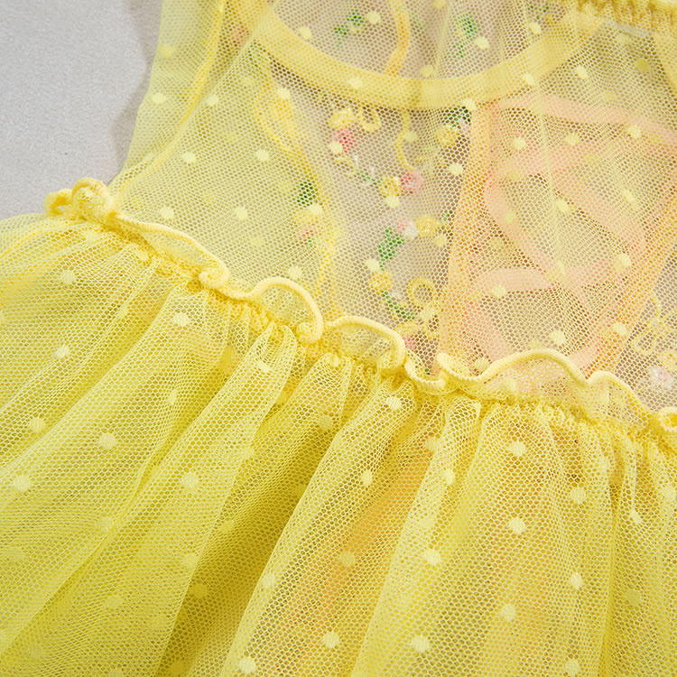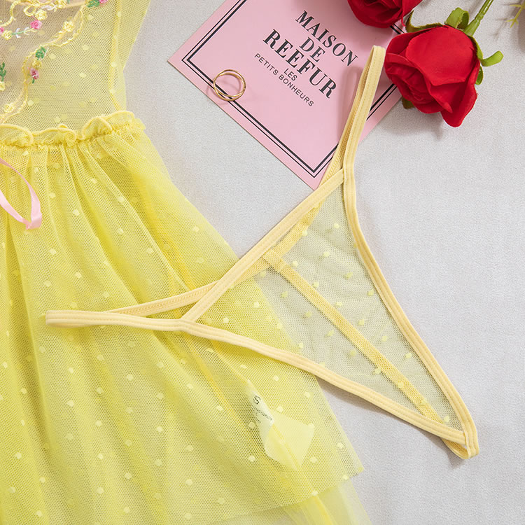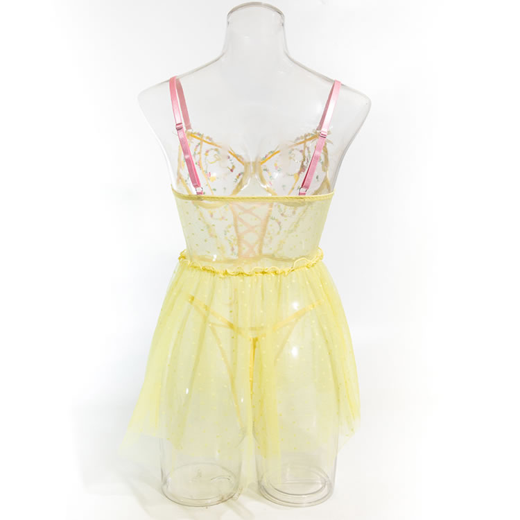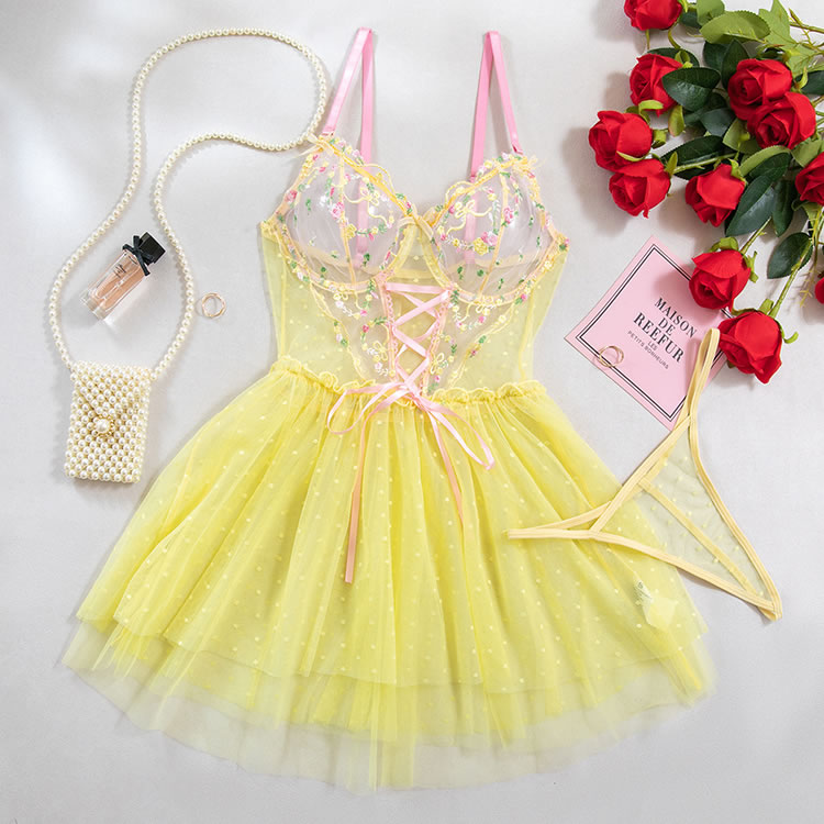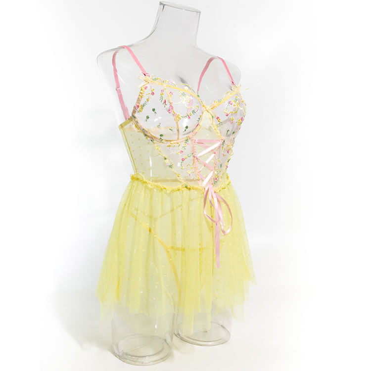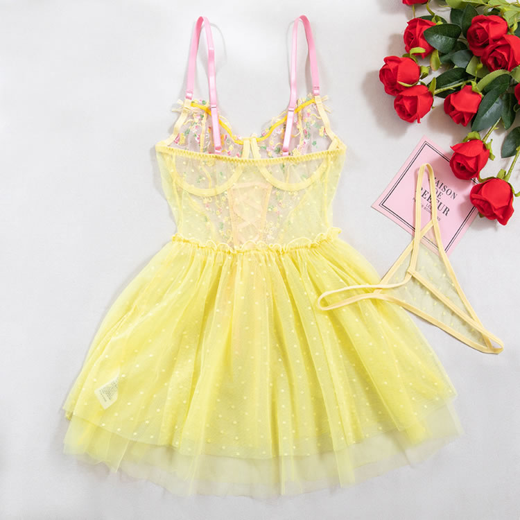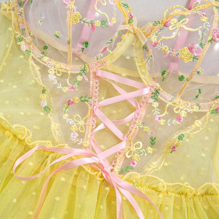 This playful lingerie dress combines a sheer mesh bodice with delicate floral embroidery and a soft pink lace-up front, creating a sweet yet bold silhouette. The top features thin pink straps and a sweetheart neckline, while the waist is accentuated by a ruffled edge that flows into a flared tulle skirt. The skirt is made of light, polka-dotted mesh fabric that adds volume and movement. Designed with a romantic flair, this piece blends innocence with a touch of sensuality, perfect for those who love whimsical styles.