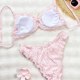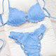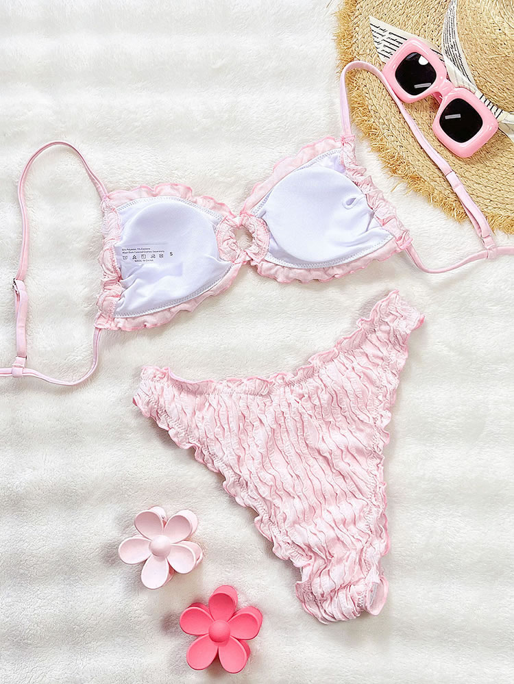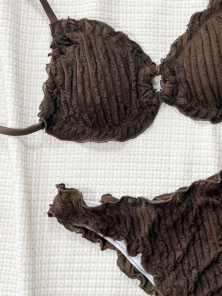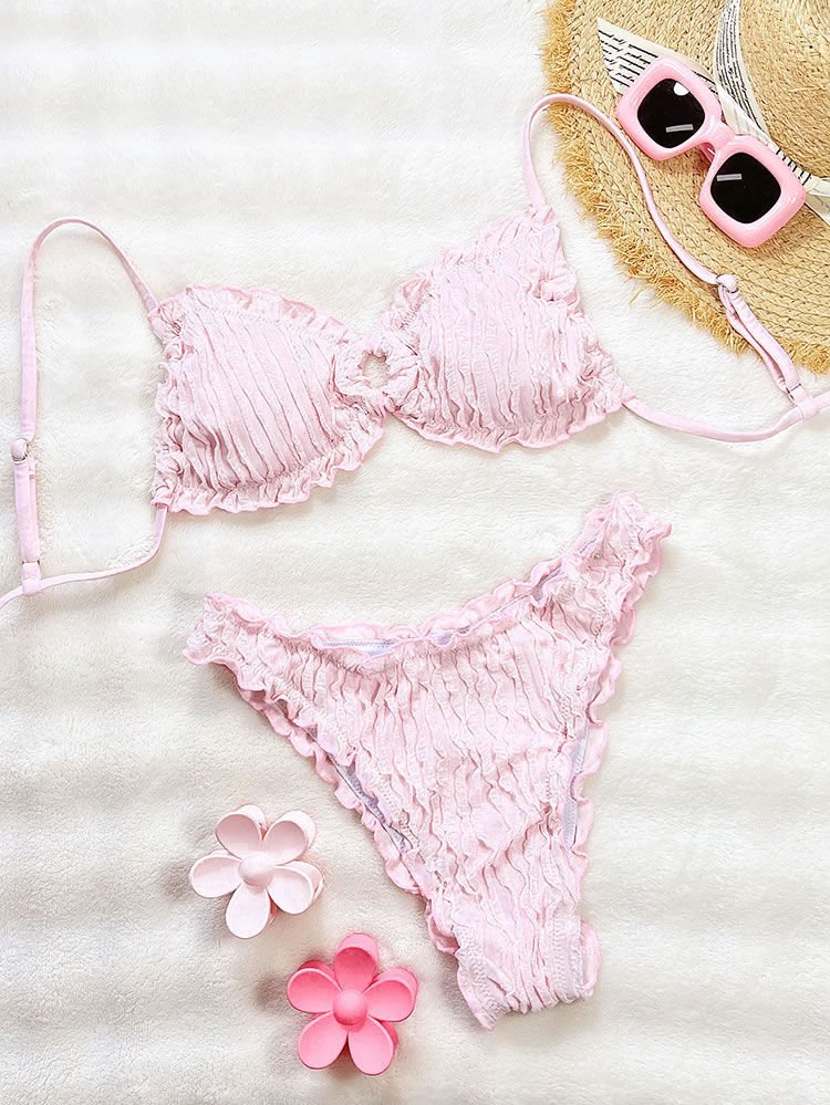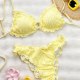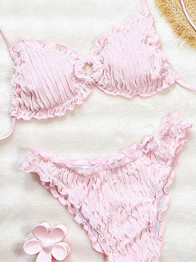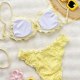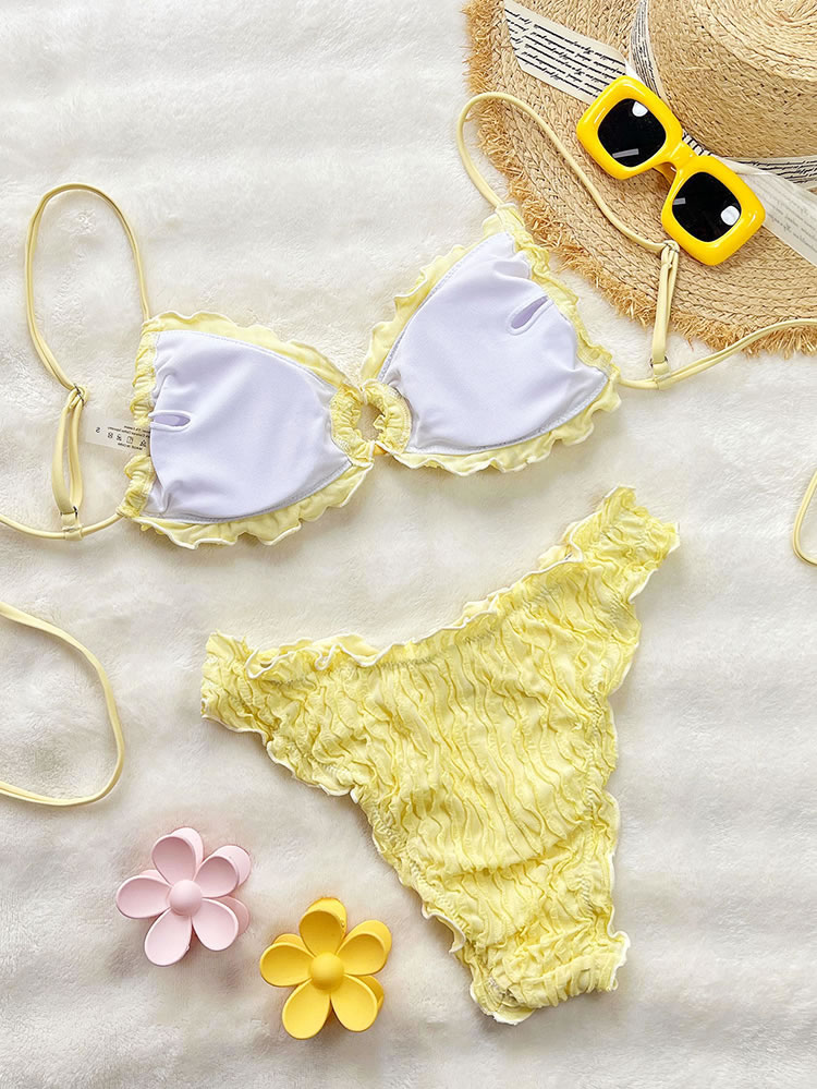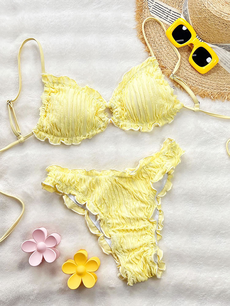 Embrace a sweet and feminine look with this charming yellow bikini. The set features a soft, crinkled texture and is finished with delicate ruffled edges on both the triangle top and the bottoms. The adjustable tie-back top and classic bikini briefs offer a comfortable and flattering fit, making it perfect for a sunny day at the beach or lounging by the pool.